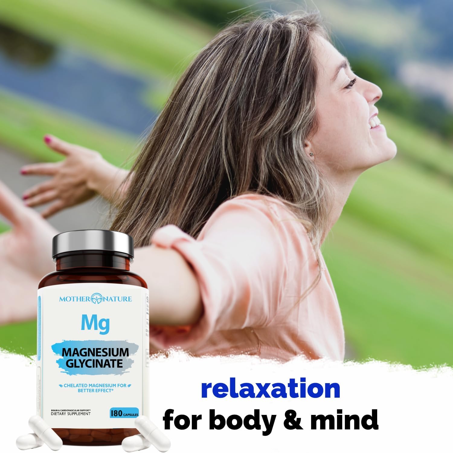 💪POWERFUL & UNIQUE FORMULATION: Our Mother Nature Magnesium Glycinate provides 275mg per serving, which constitutes 63% of the Daily Value for magnesium, representing the most bioavailable form for the body. Our unique formulation is meticulously crafted with carefully selected high-quality ingredients. This chelated Magnesium plays a vital role in reducing tiredness and fatigue, maintaining electrolyte balance, supporting normal energy-yielding metabolism, enhancing the functioning of the nervous system, and more!”