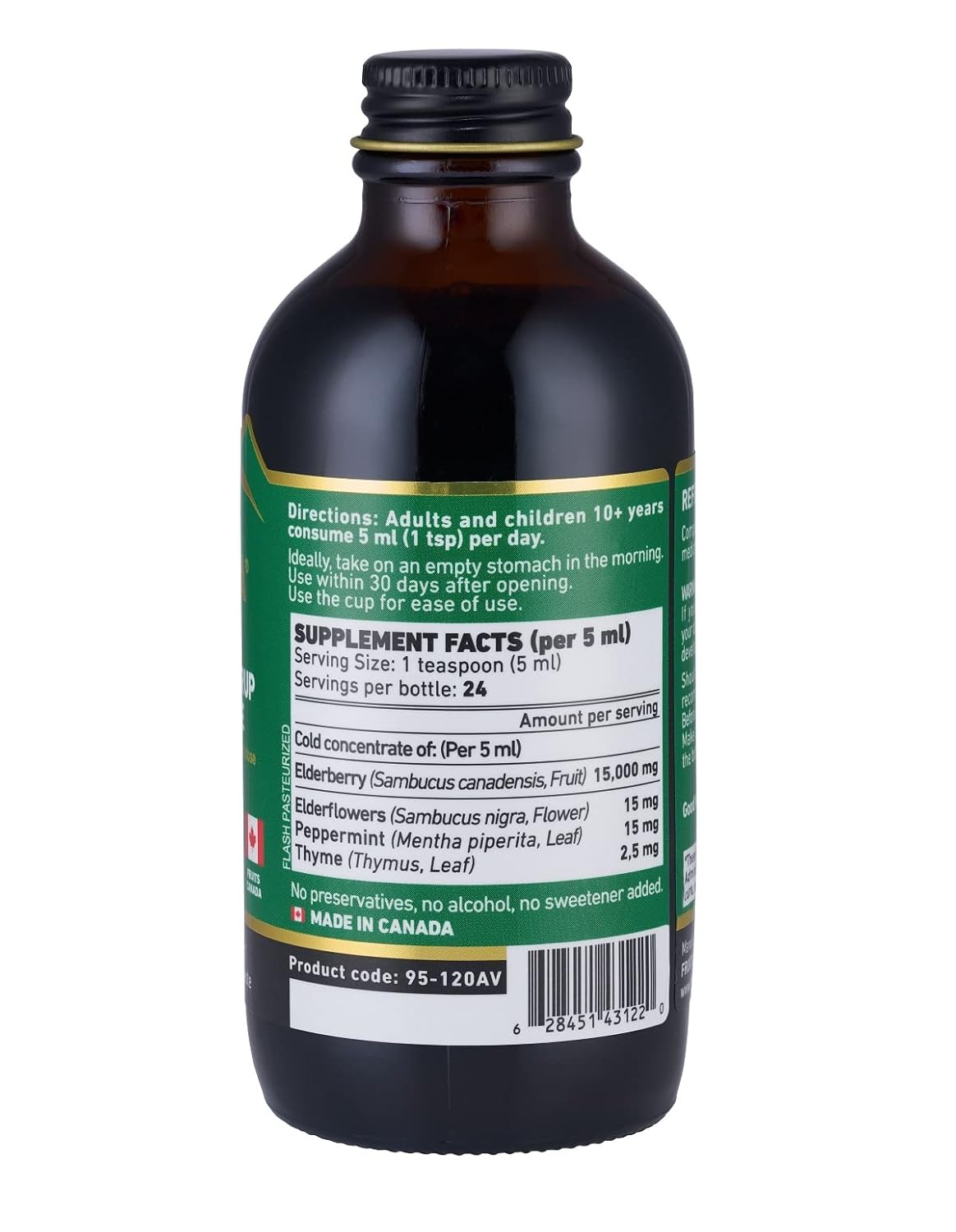 MEDICINAL INGREDIENTS (per 5 ml dose): Concentrated Organic Elderberry (15,000 mg per 5 ml), with Elderflower, Peppermint and Thyme. 100% natural. No additives. No sugar or sweetener added. No alcohol or artificial colour. Gluten-free.