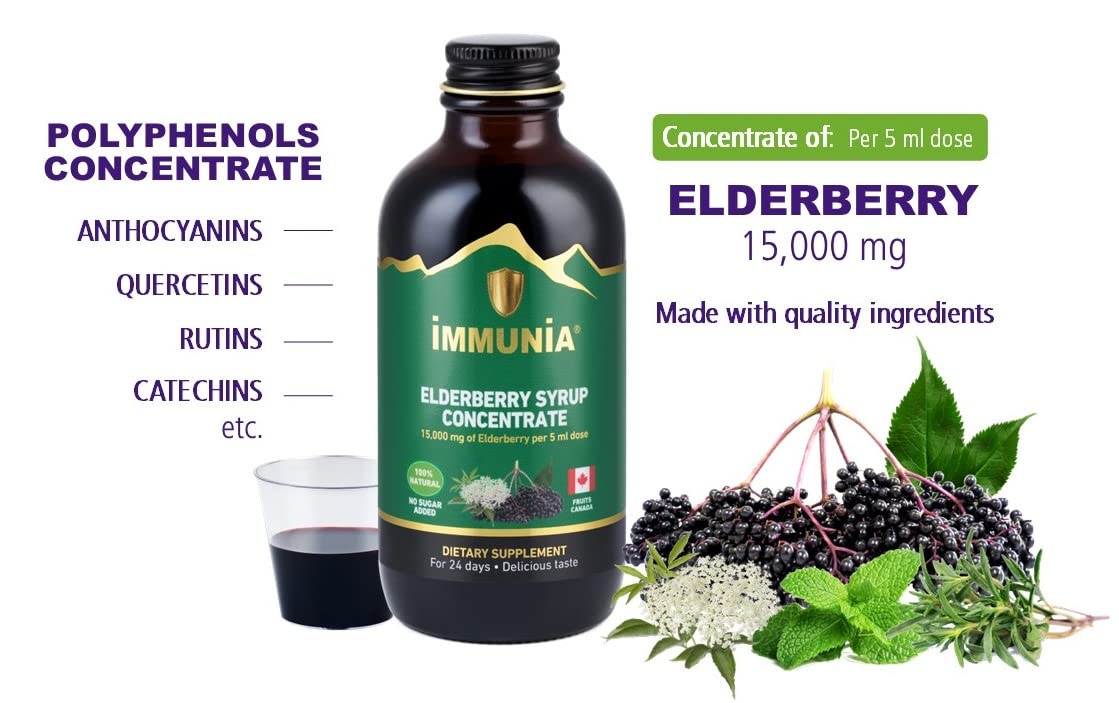 Immunia Elderberry syrup is a polyphenol supplements to ensure you obtain a good intake of antioxidants from elderberries to improve and maintain optimal health. High concentration of elderberries, concentrated through a cold process to preserve the polyphenols’ antioxidant properties.