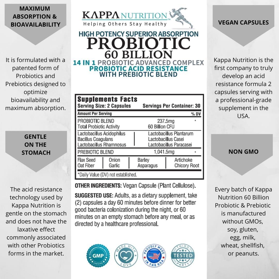 KAPPA NUTRITION (60 Capsules), Probiotic 60 Billion CFU – 14 in 1 Probiotic for Women, Men & Adults, Natural, Shelf Stable Probiotic Acid Resistance with Prebiotic Blend, Acidophilus Probiotic, from