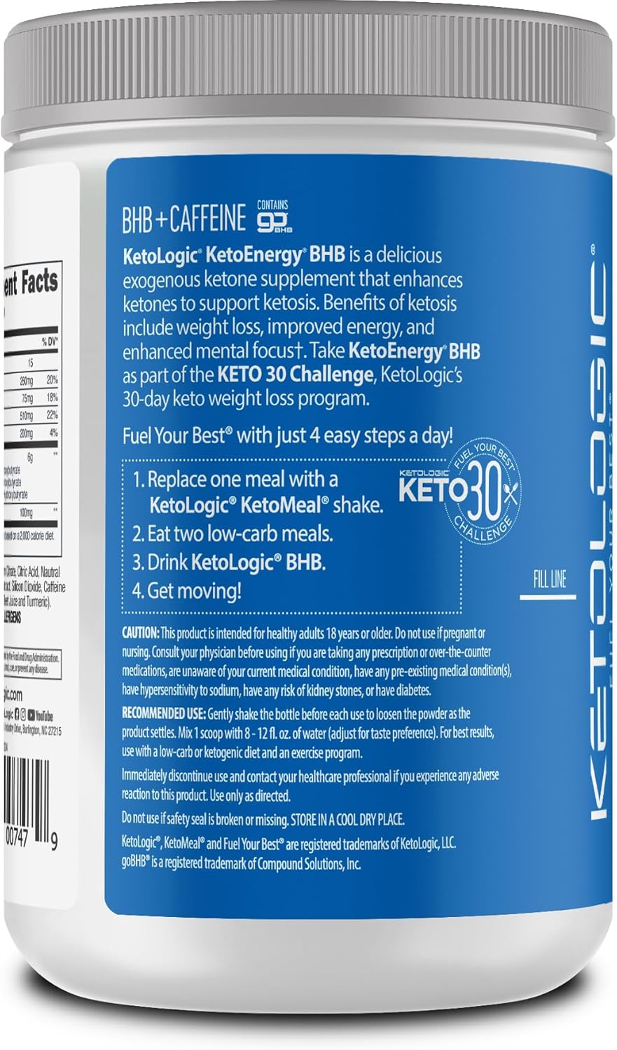 Beta-Hydroxybutyrate (BHB) is a ketone body produced by the liver, from fat, for energy when glucose isn’t available. It ultimately becomes the body and brain’s primary source of energy. KetoEnergy BHB can be taken at any time, but it’s most effective: First thing in the morning to boost your energy and help keep your ketones unpin between meals to curb cravings, suppress your appetite, and prevent energy crashes Before/during/after workouts to supplement with readily available energy Consumers of BHB include individuals looking to supplement ketogenic diets, boost physical performance, avoid sugar highs and lows, improve mental performance, and enhance fat loss while maintaining muscle mass. BHB is a great fuel alternative to carbohydrate-based (sugar-based) fuels, such as energy drinks, sports drinks, snacks, etc. FEATURES: Lab-TestedKeto-FriendlyPaleo-FriendlyVeganDairy-FreeGluten-FreeNon-GMONo artificial flavors and sweeteners RECOMMENDED USE: Gently shake the bottle before each use to loosen the powder as the product settles. Mix one scoop per 8 – 12 oz. of water (adjust for taste preference). For optimal results, consume 2 scoops with 16 – 24 oz. of water. Individual results may vary and are not guaranteed. These statements have not been evaluated by the Food and Drug Administration. This product is not intended to diagnose, treat, cure, or prevent any disease.