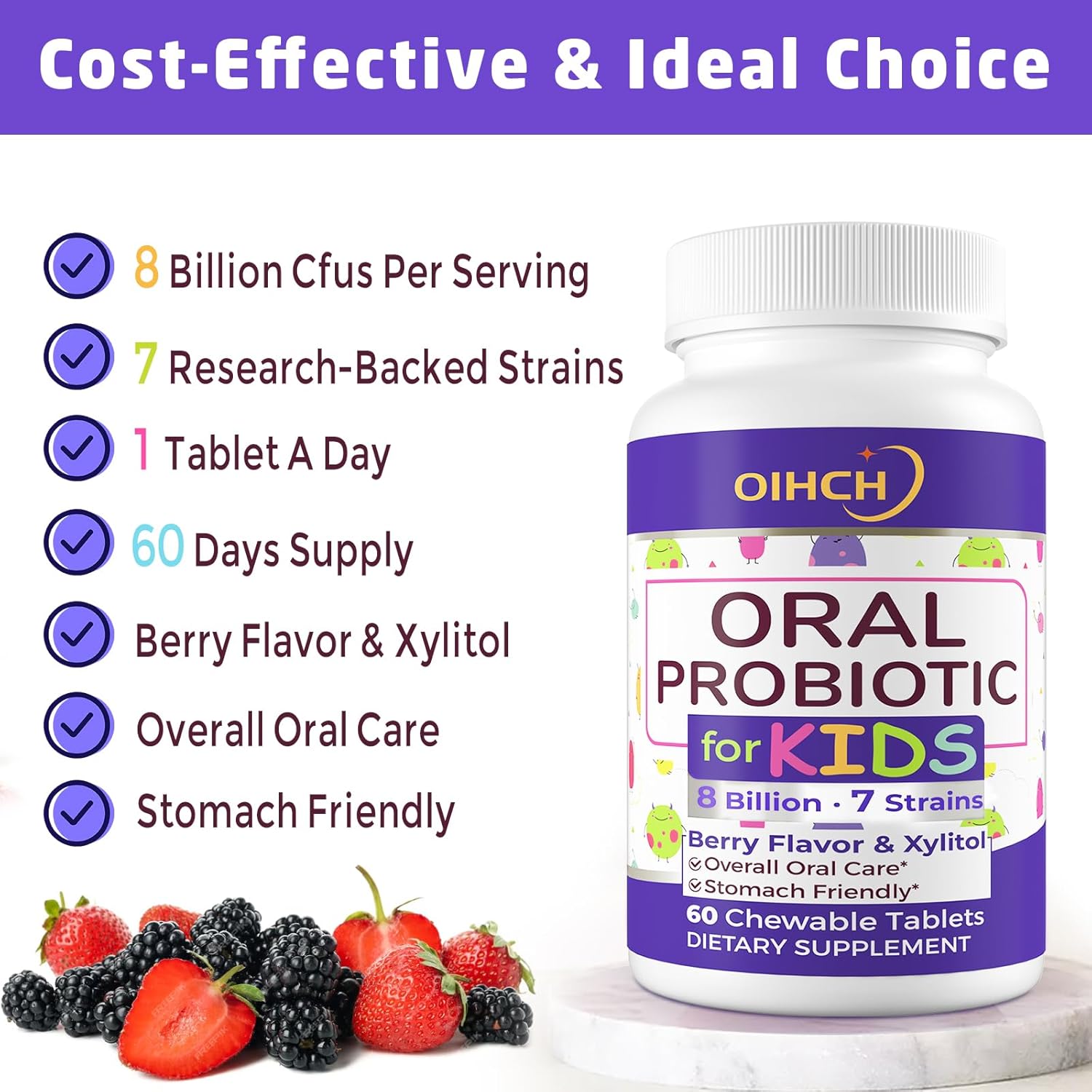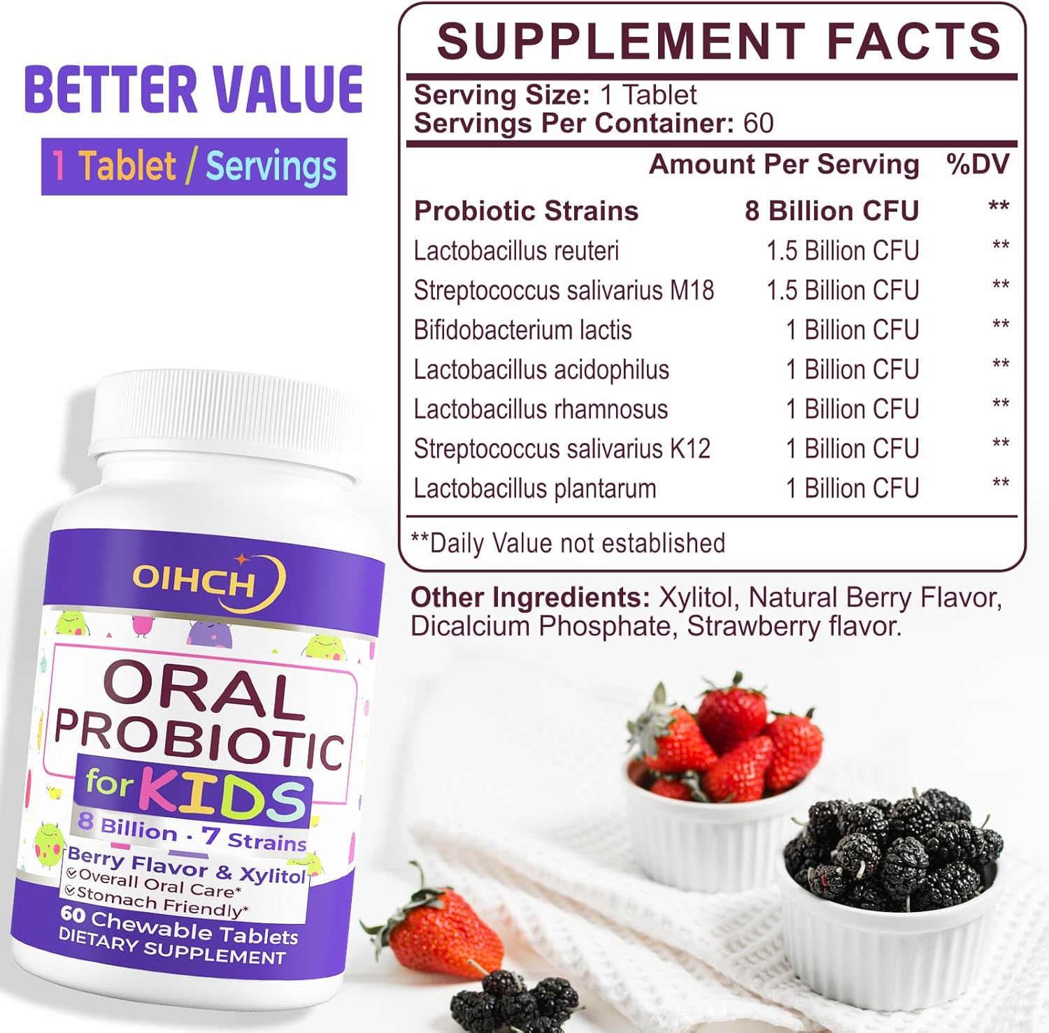 Natural Delicious and Child-Friendly: No battles over taking dental probiotic supplements! Our kids probiotic chewables come in a natural berry flavor that kids love, sweetened with tooth-friendly xylitol, making daily oral care fun and enjoyable. 60 oral probiotics tablets, convenience of just 1 tablet per day. Oral probiotics for kids is shelf stable and is the best choice at home or on the go