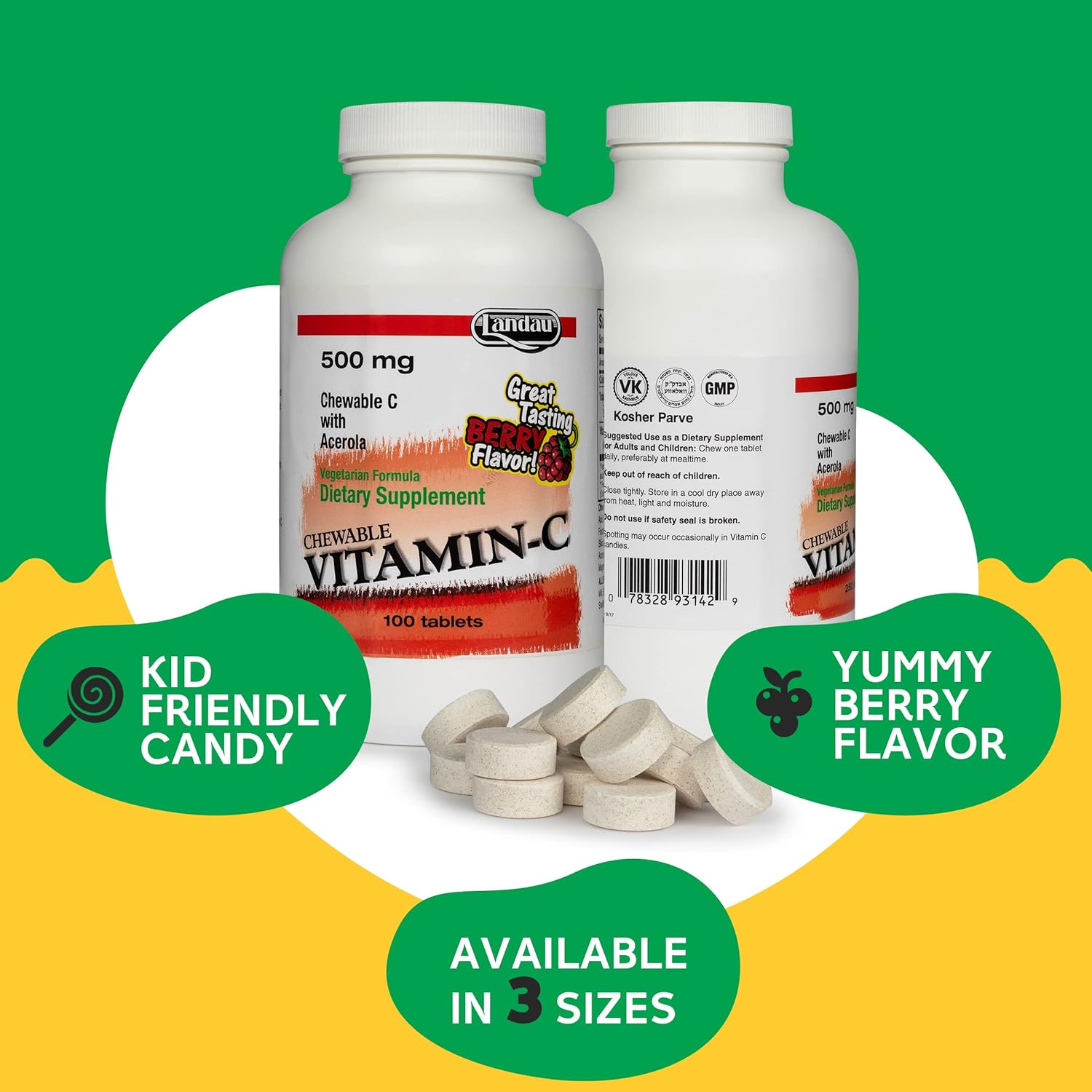 Landau 500mg Chewable Vitamin C Candy for Kids & Adults – Easy-to-Take Vitamin C Supplement with Acerola – Kosher & Made in The USA – Great Tasting Berry Flavor, 100 Tablets