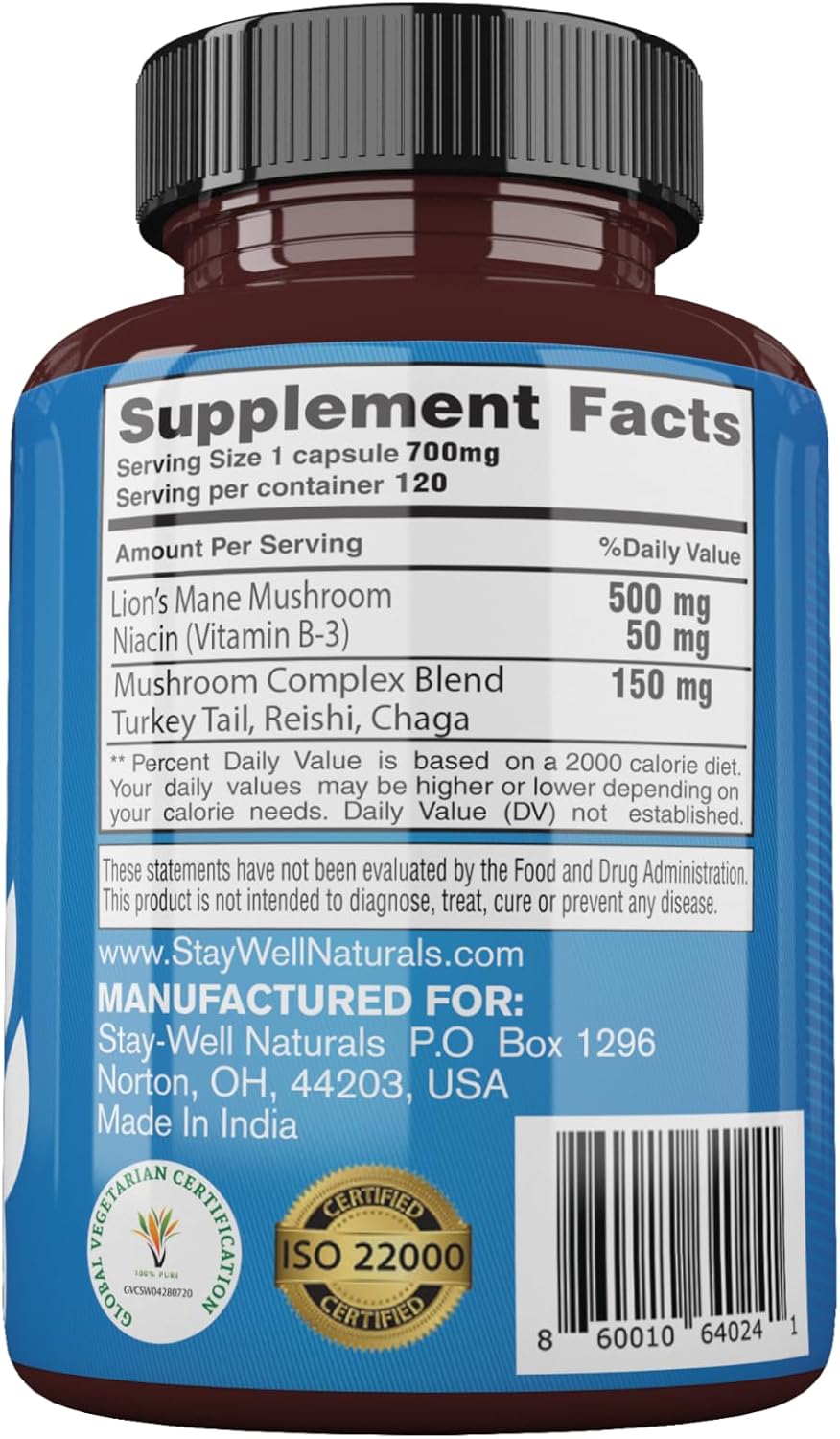 Stay-Well Naturals Lions Mane Supplement Capsules with Niacin | Mushroom Supplement, Turkey Tail Mushroom Capsules with Chaga Mushroom and Reishi Mushroom Extract Nootropic Supplement Lion’s Mane Capsules with Niacin for Ultimate Brain Support: Made of hand-picked Lion’s Mane mushroom extract and Vitamin B3 (Niacin), our supplement provides maximum distribution and benefits to support cognitive function and overall well-being. Lion’s Mane: Our Organic Lions mane mushroom capsules are 100% natural and 3rd party tested to guarantee the highest quality and purity possible. Niacin (Vitamin B3): A critical vitamin that is naturally occurring in the body that creates a slight flushing effect which makes it an excellent agent for delivering nutrients deep into the neural extremities. Potent Mushroom Complex: Containing Turkey Tail, Reishi, and Chaga extract. We produce organic mushroom supplements that support overall health. Our products contain 100% organic mushrooms, carefully sourced and processed for potency & efficacy. GMP CERTIFIED / FDA REGISTERED: GMP certification means that every aspect of the Stay-Well manufacturing process has been examined, including our laboratory/testing methods (for stability, potency, and product formulation) in a registered FDA facility.