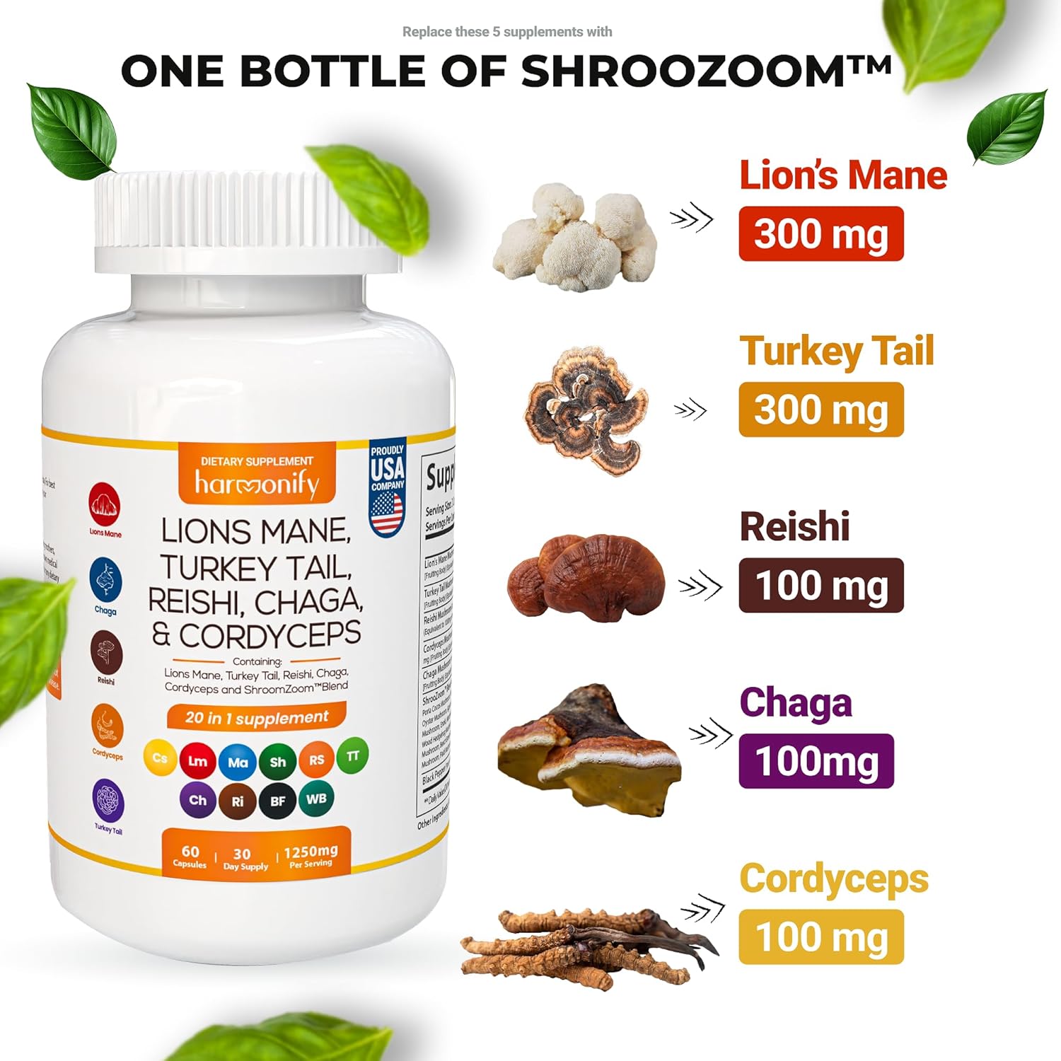 Discover the holistic benefits for both women and men with our comprehensive mushroom supplement, carefully crafted to support overall wellness. Our blend includes 20 different types of mushroom extracts, ranging from Lions Mane capsules to Turkey Tail mushroom extract, Reishi mushroom powder, Chaga mushroom capsules, and Cordyceps sinensis. Harnessing the power of nature, our potent Lions Mane Mushroom Supplement delivers remarkable results. Embrace our special mushroom ingredients that form the cornerstone of our holistic approach. From Lions Mane to Turkey Tail, Reishi to Cordyceps, our blend encompasses a wide array of mushrooms including Maitake, Meshima, Poria Cocos, Shiitake, Tremella, and more. Each ingredient is meticulously selected to provide a synergistic blend that promotes balance and well-being. Experience the convenience of our all-in-one support supplement. Our mushroom complex capsules offer a powerful alternative to traditional options like Lions Mane tea, Reishi mushroom tea, Reishi coffee, Chaga coffee, tinctures, and gummies. Elevate your wellness routine with HARMONIFY, your trusted partner on the path to holistic health.