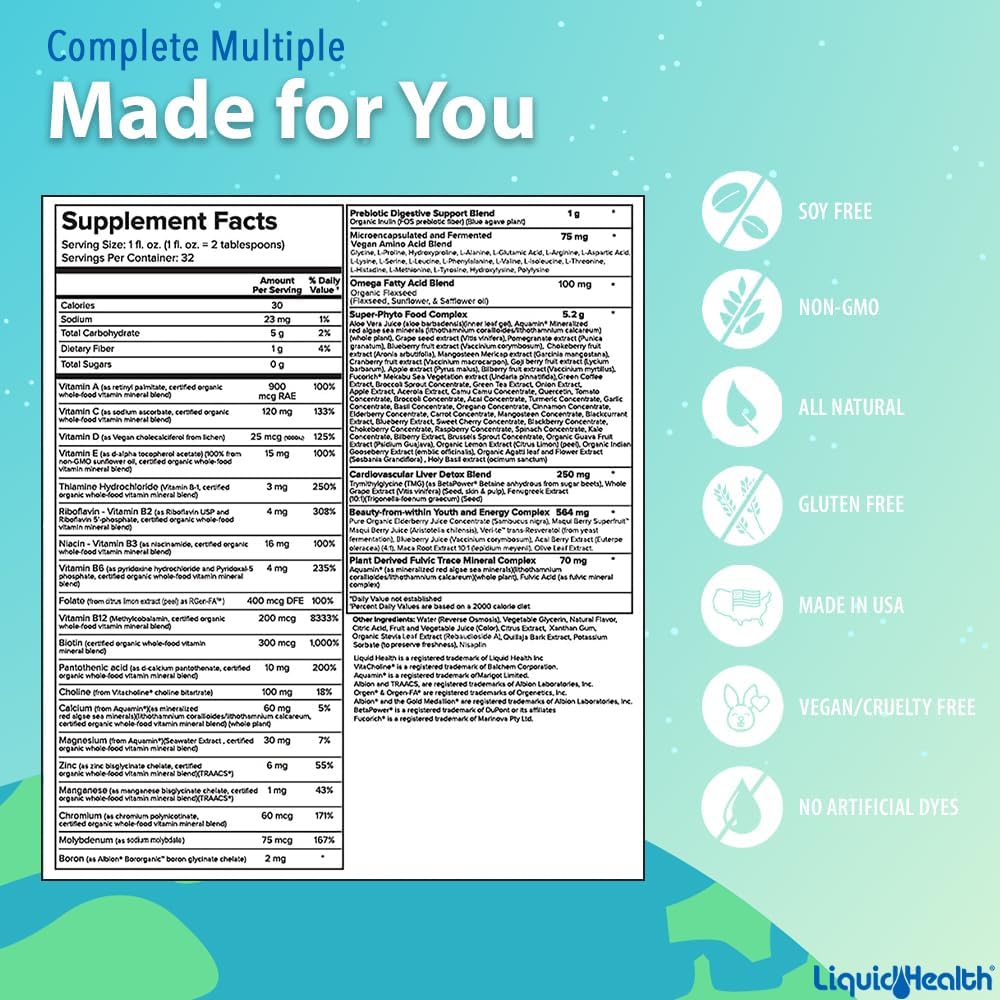 COMPLETE LIQUID MULTIVITAMIN FOR MEN & WOMEN: Liquid Health’s Complete Multiple provides over 200 essential vitamins, minerals, and nutrients for whole body health you can FEEL! With the Digestive Support blend, Amino Acids, Youth & Energy complex, and Trace Minerals you’ve got everything you need to keep your gut healthy, immune system boosted, energy levels up, and brain sharp.