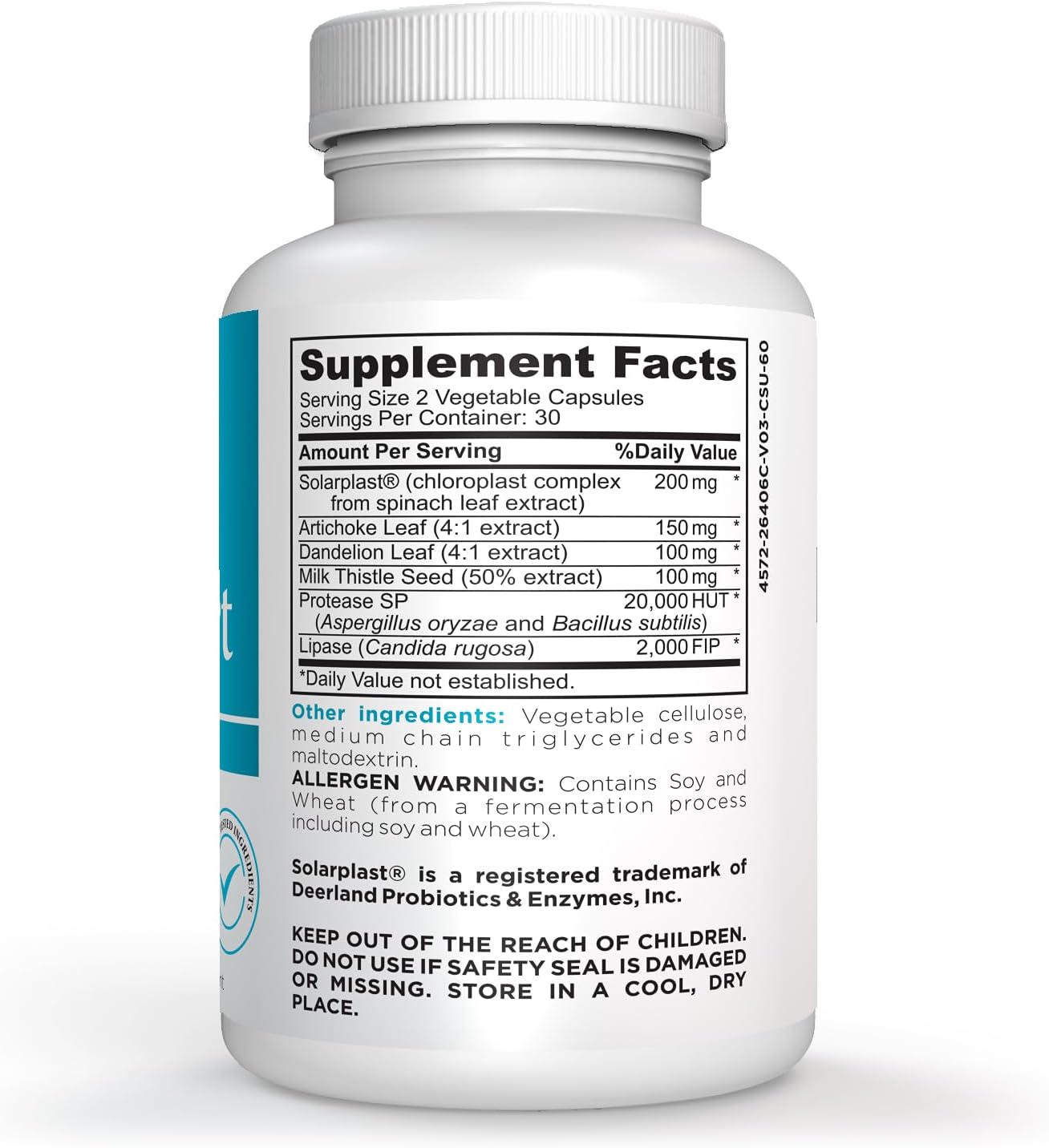Aids detoxification and liver health with milk thistle, artichoke leaf, dandelion root and chlorophyll extract.*