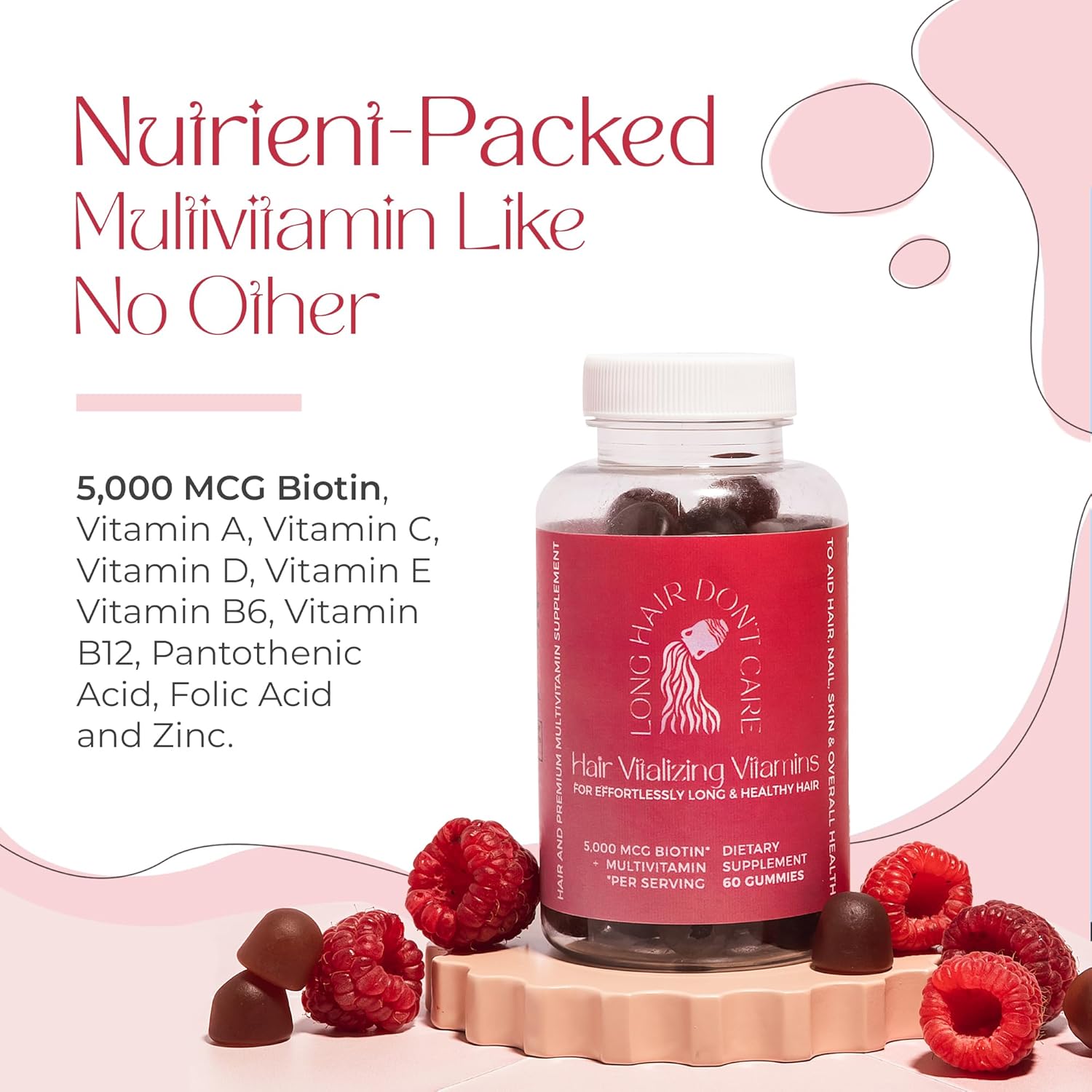 Long Hair Don’t Care Hair Vitalizing Vitamins, Hair Skin and Nails Vitamins, Vitamins for Women and Men, Pantothenic Acid, Folic Acid & Biotin Gummies, Non-GMO Hair Vitamins, 60 Gummy Vitamins