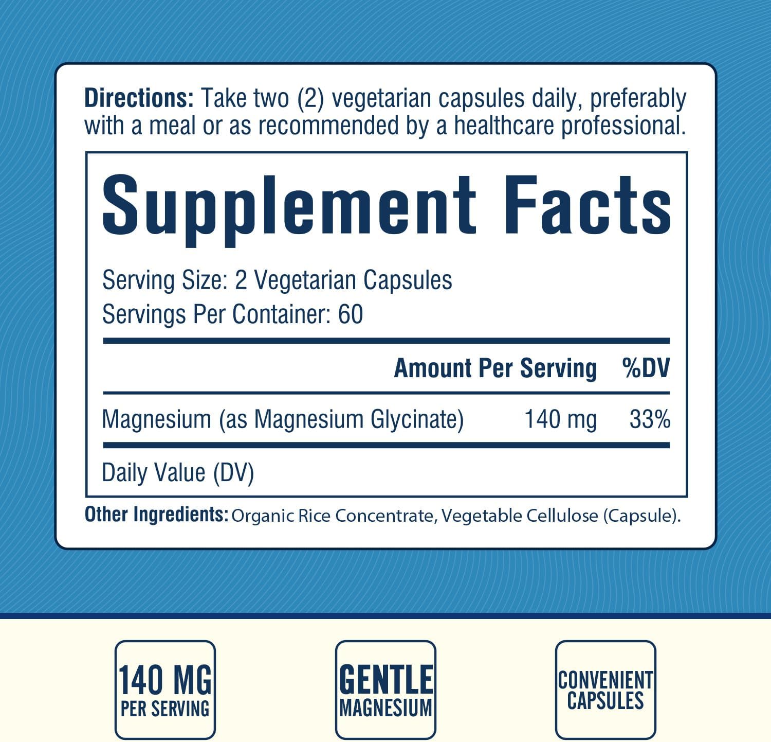 Magnesium Glycinate, 140 mg Elemental Magnesium Per Serving, Non Buffered, Max Absorption, Muscle Function, Nerve Health & Relaxation Support, 120 Vegetarian Caps