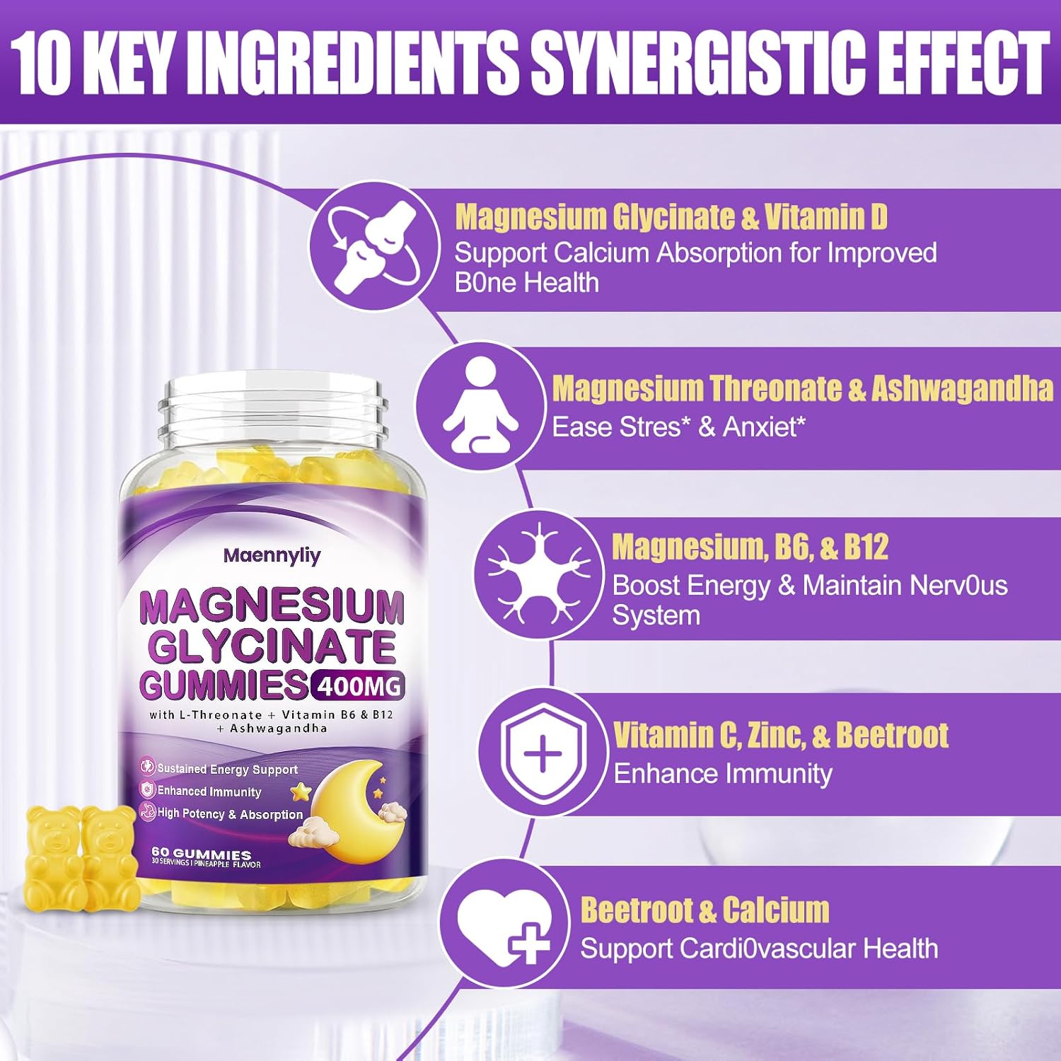 Magnesium Glycinate 400mg Gummies for Adults – High Bioavailable Magnesium Glycinate Gummies with 200mg Magnesium L-Threonate, with Ashwagandha, Beetroot – Supplement for Night Rest, M00d, Muscle