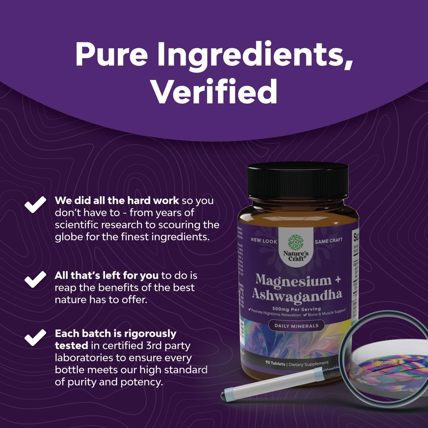 Magnesium Glycinate 500mg with Ashwagandha Root – Calming Magnesium Supplement for Women and Men – Vegan 500mg Magnesium Buffered Chelate per Serving for Mood Sleep and Relaxation – 90 Tablets