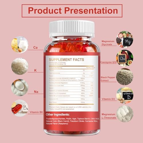 SYNERGISTIC FORMULA:Magnesium Gummies contain 400mg Magnesium Glycinate,200mg Magnesium L-Threonate, 500mg Calcium, 99mg Potassium,Vitamin D3,B6,Coenzyme Q10 etc.Potassium and magnesium are two synergistic minerals that keep our body, mind and mood healthy.Vitamin D promotes the absorption of Calcium & Phosphorus,Vitamin B6 can participate in amino acid metabolism and conversion,promote body absorptioncan,Coenzyme Q10 promote heart health,Magnesium L Threonate can help support cognitive health.