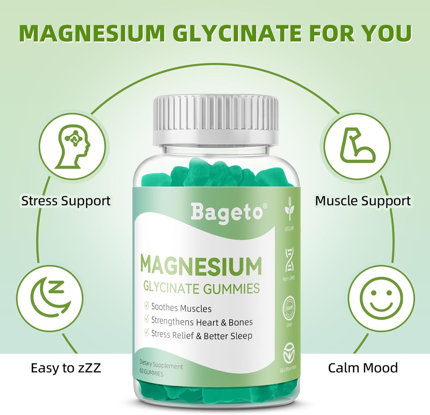 Sugar-Free Gummies: We all acknowledge the detrimental effects of sugar on our health. That’s why our Calm Gummies are completely sugar-free. Bageto promises vegan, natural, non-GMO, and gluten-free gummies! Enjoy the natural mixed berry flavor; they’re soft, easy to chew, and a tastier alternative to capsules, pills, and powders. Our Magnesium Glycinate gummies are designed to promote advanced relaxation, with a supply of 60 gummies per package, providing 30 servings.