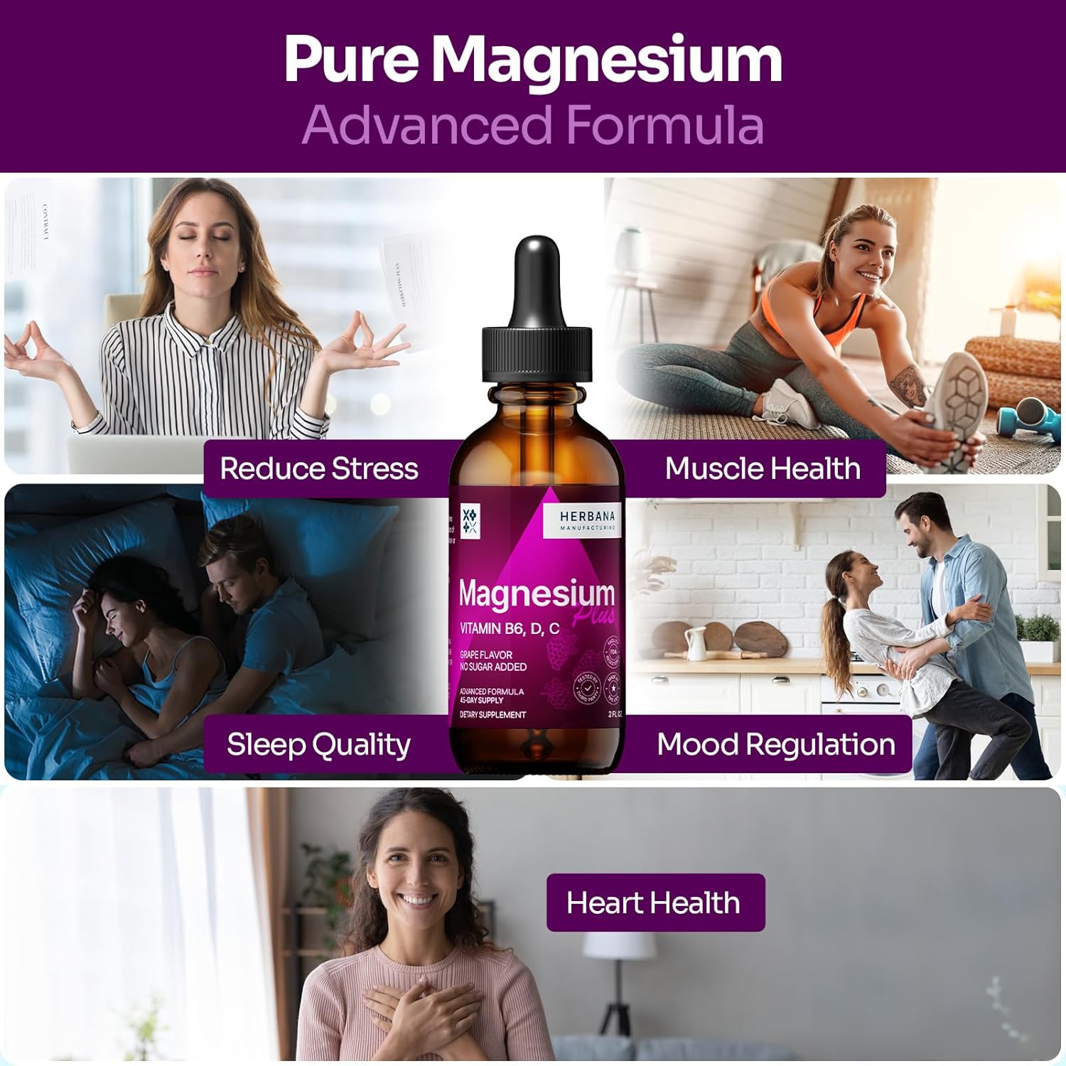 Magnesium Plus Grape Flavor 2 fl oz Liquid Drops – Advanced Complex Magnesium Citrate, Glycinate, L-threonate with Vitamins B6, D, C Supplement – High Potency 100% Absorption – 45-Day Supply