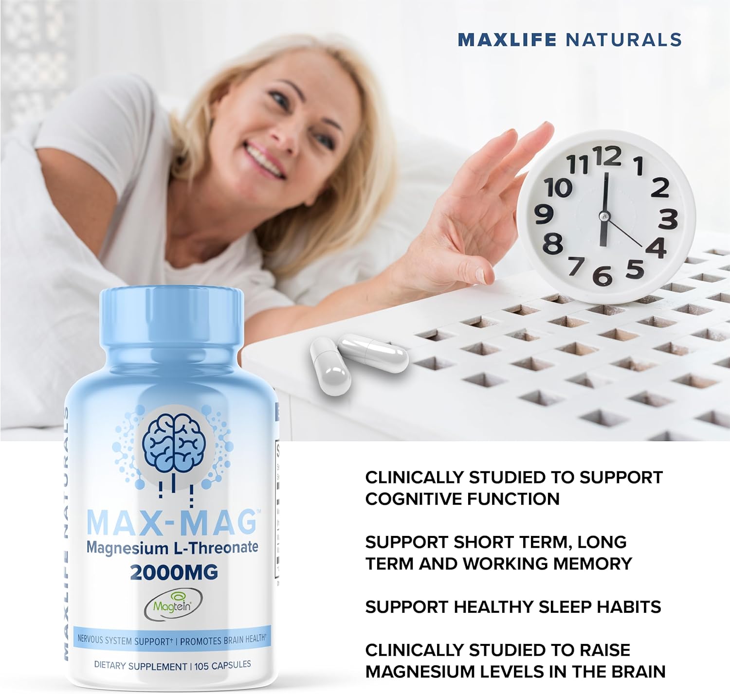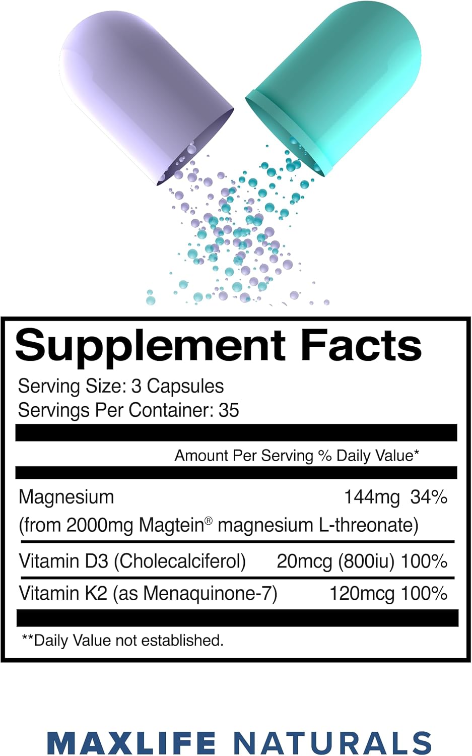 Max-Mag Magnesium L-Threonate 2000mg Magtein, Magnesium Threonate 105 Caps with Vitamin D3 and K2, High Absorption – Bioavailable Mag (35 Servings)