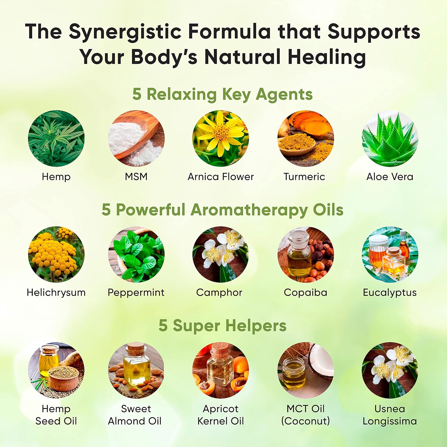 All-Natural Breakthrough Formula: Have a peace of mind when you use our hemp oil for skin that features a synergistic blend of premium-grade hemp, arnica oil, MSM, helichrysum, camphor, and 16 more plant-based ingredients & essential oils to keep your body moisturized and relaxed.