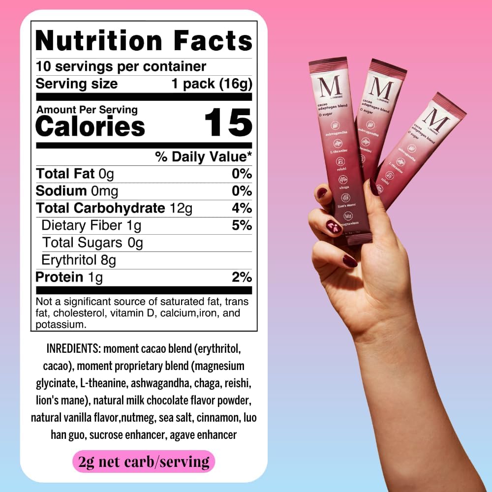 Moment Cacao Adaptogen Mushroom Blend (Shark Tank) Coffee Alternative | Zero Sugar Chocolate Powder | Mushroom Drink | Ashwagandha, Chaga, Lion Mane, L-theanine | Focus & Energy | 15 Servings