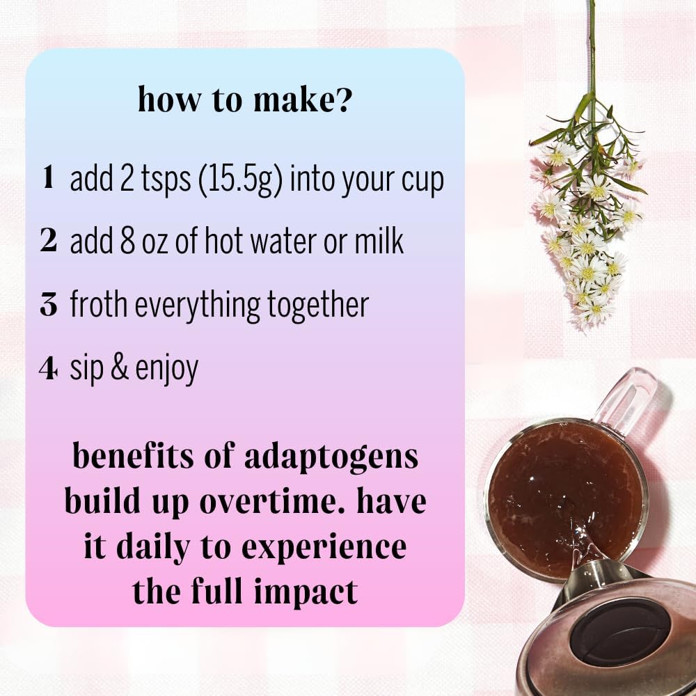 ✨ FUNCTIONAL ADAPTOGENS & MUSHROOMS: Enjoy a blend of Ashwagandha, L-theanine, Chaga, Reishi, and Lion’s mane. These key ingredients of our cacao adaptogen blend help enhance mental clarity, improve focus, and lift your mood to start your day the right way.