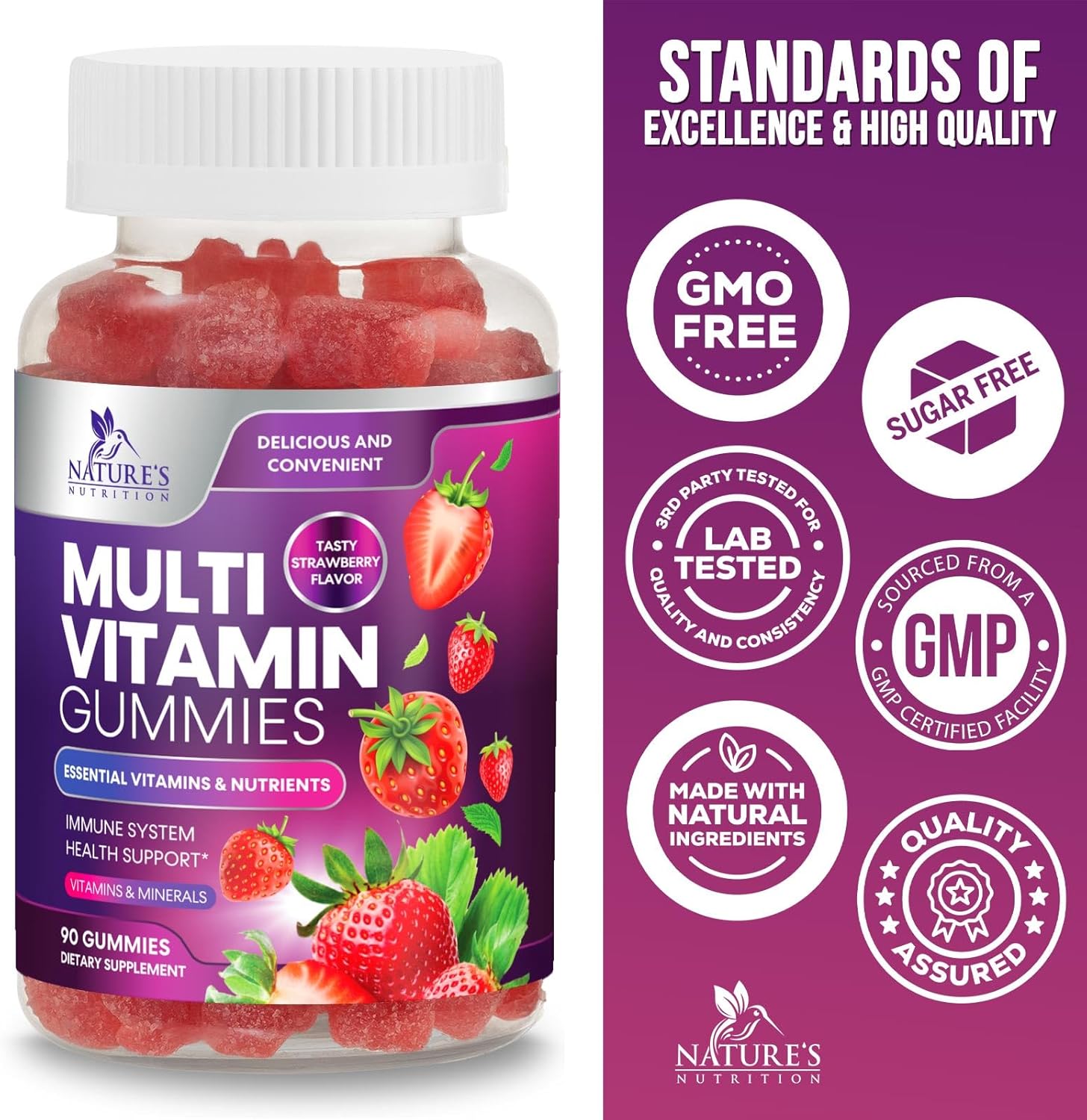Multivitamin Gummies for Adults, Daily Gummy Vitamin for Women & Men, Extra Strength Immune Health Support Supplement with Vitamins A, C, D, E, B-6, B-12, Zinc and More – Non-GMO, Berry – 90 Gummies