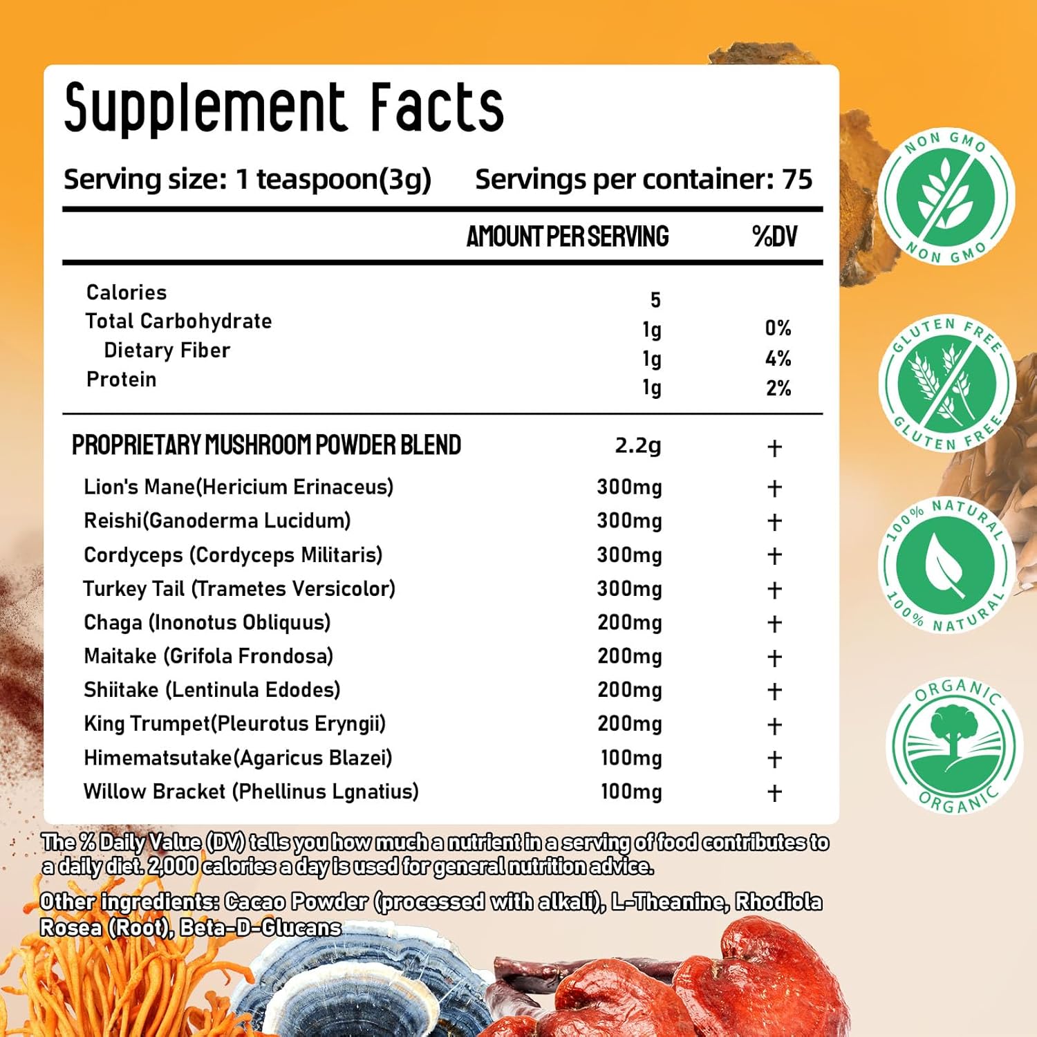 Mushroom Coffee (57 Servings) & Mushroom Powder (75 Servings), Mushroom Supplements, Lions Mane, Reishi, Chaga, Cordyceps Support Immune, Energy, Focus -8oz (without Teaspoon)