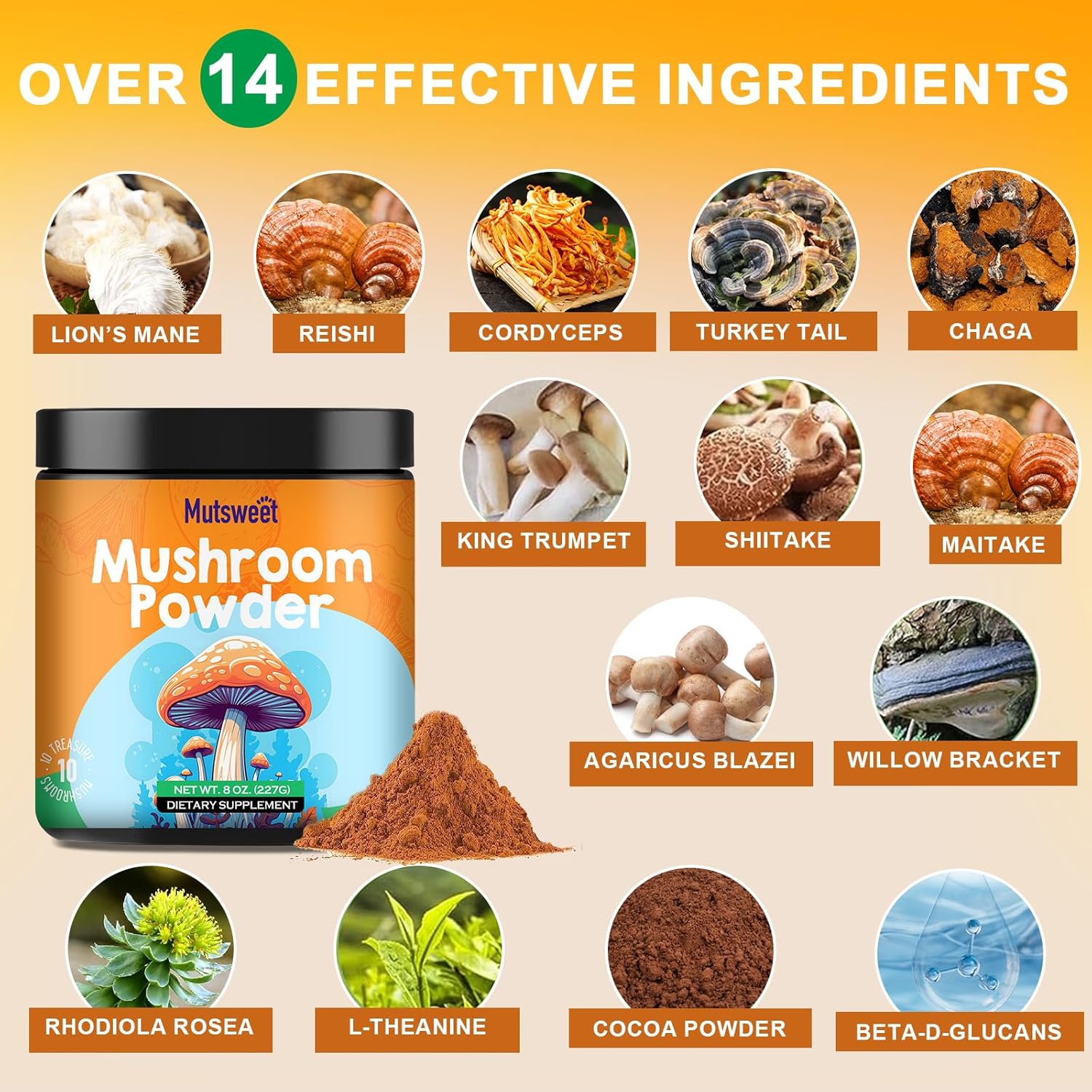14-in-1 Mushroom Powder: Mutsweet mushroom powder contains 10 natural functional mushroom blends includes Lions mane, Reishi, Cordyceps, Turkey Tail, Chaga, Maitake, Shiitake, Agaricus Blazei, King Trumpet, Willow Bracket. Rich in immune vitamins (B complex vitamins, vitamin C, vitamin D), minerals (vitamins zinc, calcium, magnesium) and antioxidants. Our Super Mushroom powder uses the purest L-theanine, which makes relax and calm.