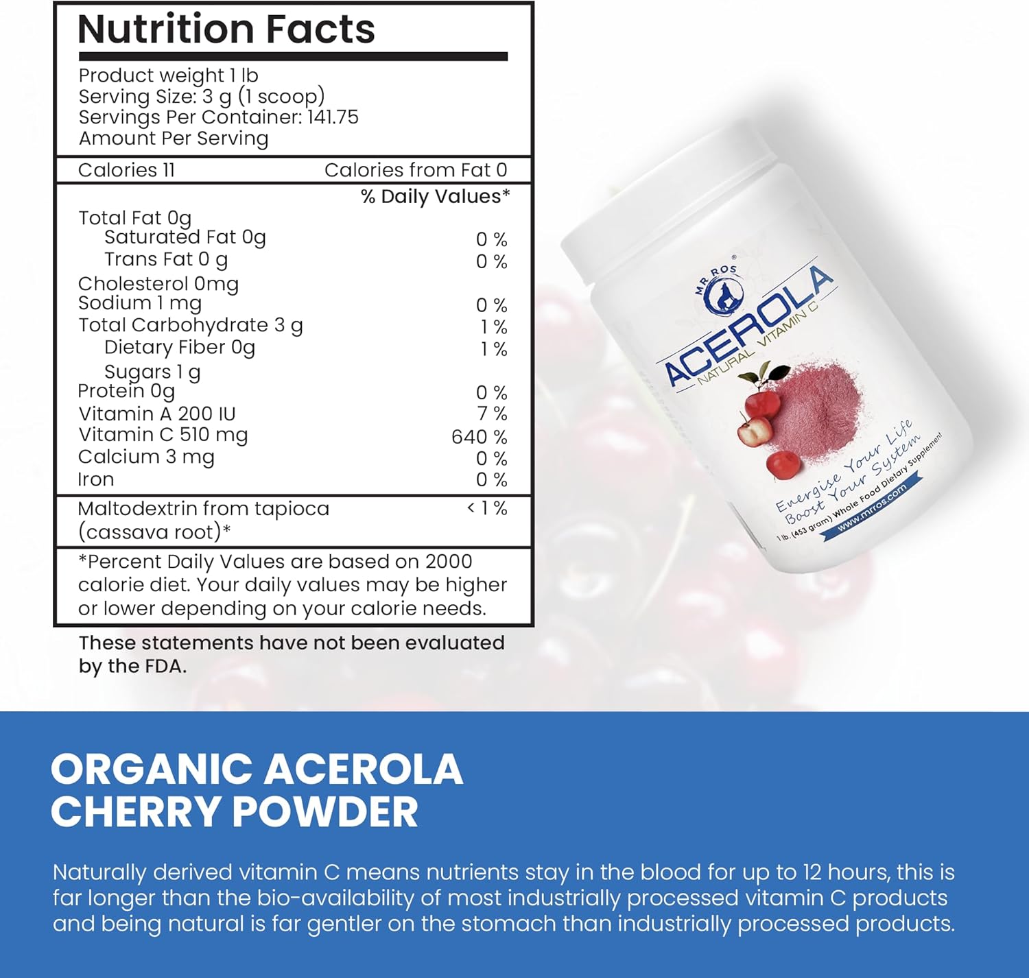 ORGANIC ACEROLA CHERRY POWDER: Naturally derived vitamin C means nutrients stay in the blood for up to 12 hours, this is far longer than the bio-availability of most industrially processed vitamin C products and being natural is far gentler on the stomach than industrially processed products. Mr Ros Vitamin C powder is made from high quality ingredients that are totally free from harsh chemicals and artificial additives. This vitamin C powder dissolves easily into almost any liquid.