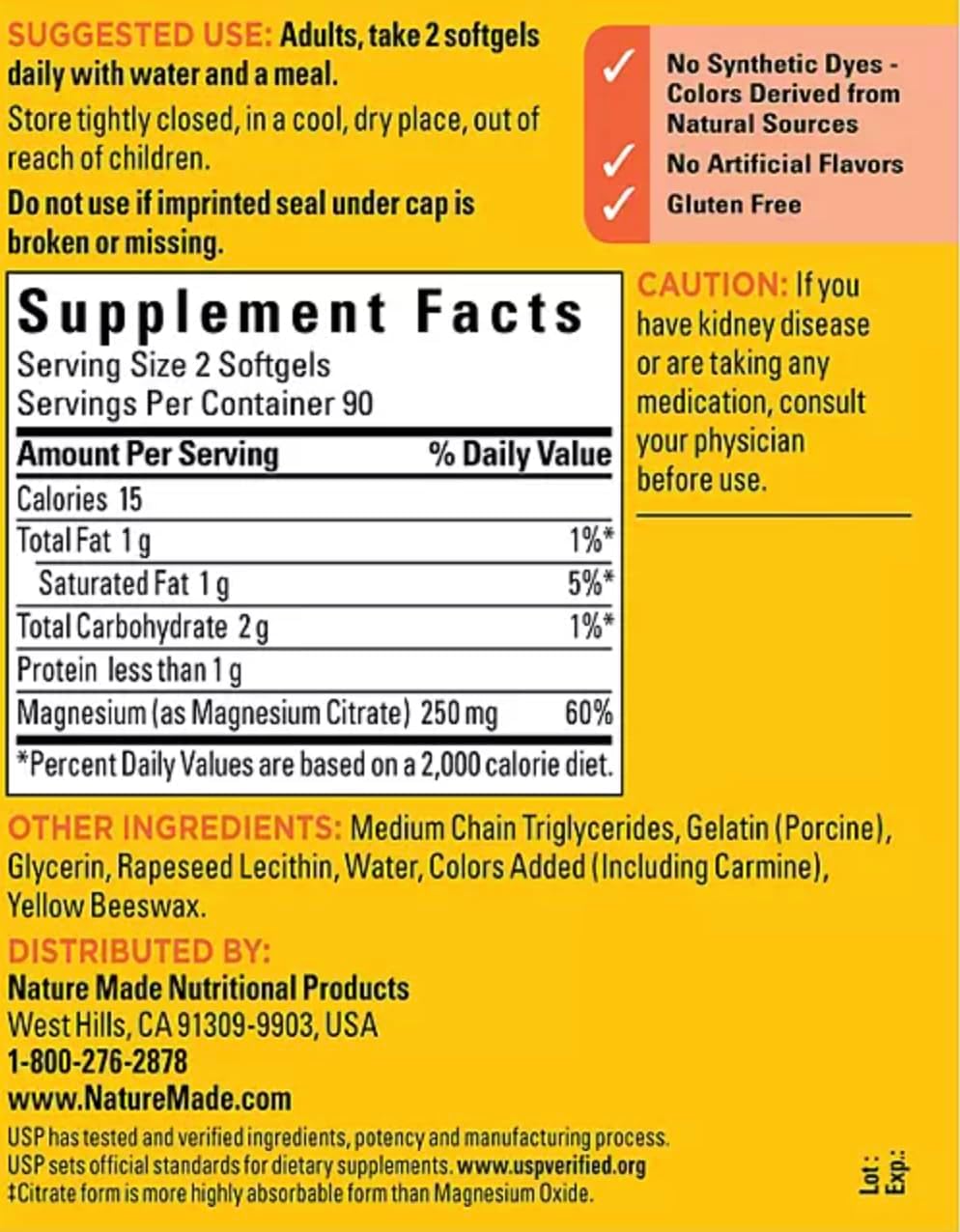 Nature Made Magnesium Citrate 250 mg per serving is a magnesium supplement for men and women that helps support muscle relaxation, nerve health, and heart health. This 250mg Magnesium Citrate supplement also supports bone health. Sourced from high-quality ingredients, this Magnesium supplement is gluten free and contains no synthetic dyes and no artificial flavors. These Nature Made Magnesium 250 mg per serving dietary supplements absorb better due to their Magnesium Citrate form, and help relax the body with each Magnesium softgel. Nature Made Magnesium supplements offer a Magnesium Citrate 250mg choice for people who do not consume enough Magnesium in their diet, which is over half of the U.S. population. Adults take two Magnesium Citrate softgels daily with water and a meal.