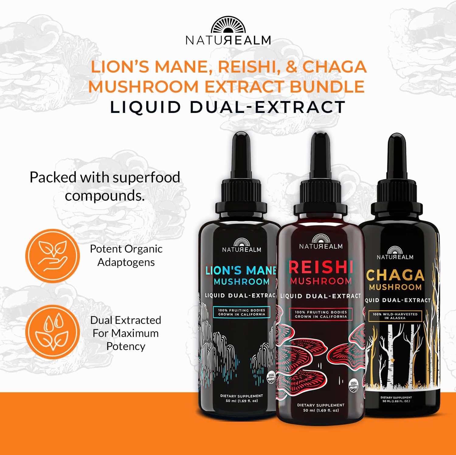Naturealm Lion’s Mane, Reishi, & Chaga Mushroom Extract – Adaptogen Stack for Focus, Immunity, Longevity, Gut Health, Anti-Aging, Energy, Healing, & More – Organic Liquid Drops – 50 mL Each (3 Pack)