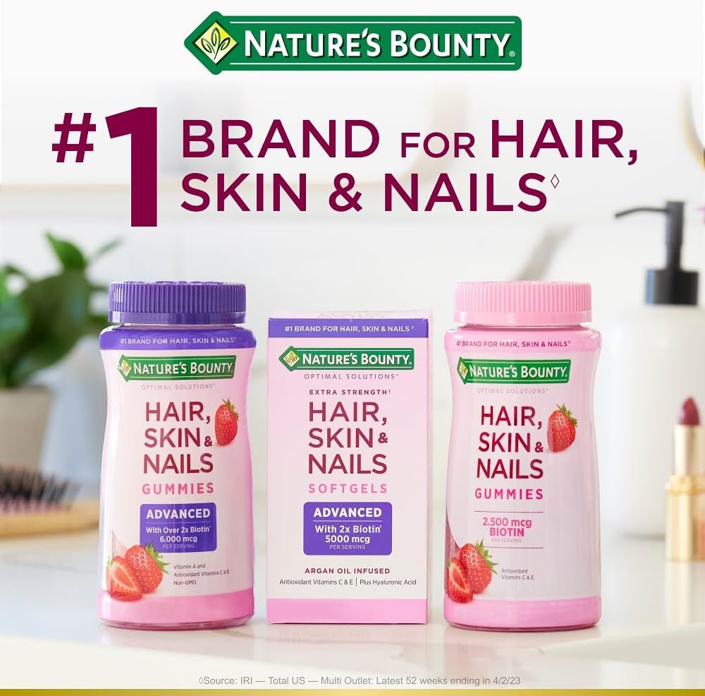Give your beauty routine an upgrade with new Nature’s Bounty advanced hair skin & nails gummies! Packed with 2x the amount of Biotin as our leading hair, skin & nails gummy formula, each serving contains 6, 000mcg of Biotin to support beautiful hair, glowing skin, and healthy nails. (1) Bursting with the same delicious Strawberry flavor as our original hair, skin & nails gummies, our advanced formula is Non-GMO and now includes vitamin A which plays an essential role in maintaining skin health.(1) Our advanced hair, skin & nails gummies also contain antioxidants Vitamin C and Vitamin E. Vitamin C is involved in the production and formation of collagen, acting as the basis for glowing skin, while Vitamin E is a nutrient that is found on the outermost skin surface.(1) As an added bonus, our delicious gummies are and made from naturally sourced flavors, making them the perfect supplement to your beauty regimen from the #1 brand for hair, skin & nails.(2)