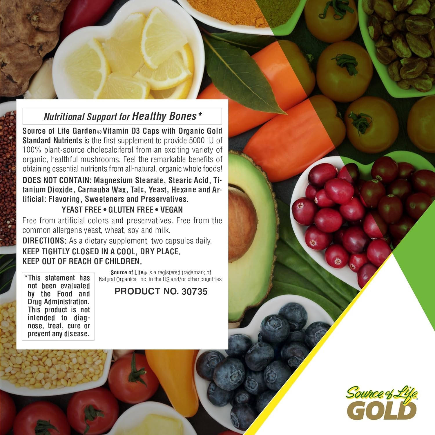 HIGH POTENCY – Source of Life Garden Vitamin D3 5000 IU covers your recommended daily intake of Vitamin D3. The organic whole food base is made of fruits, vegetables, green foods, mushrooms, and algae.