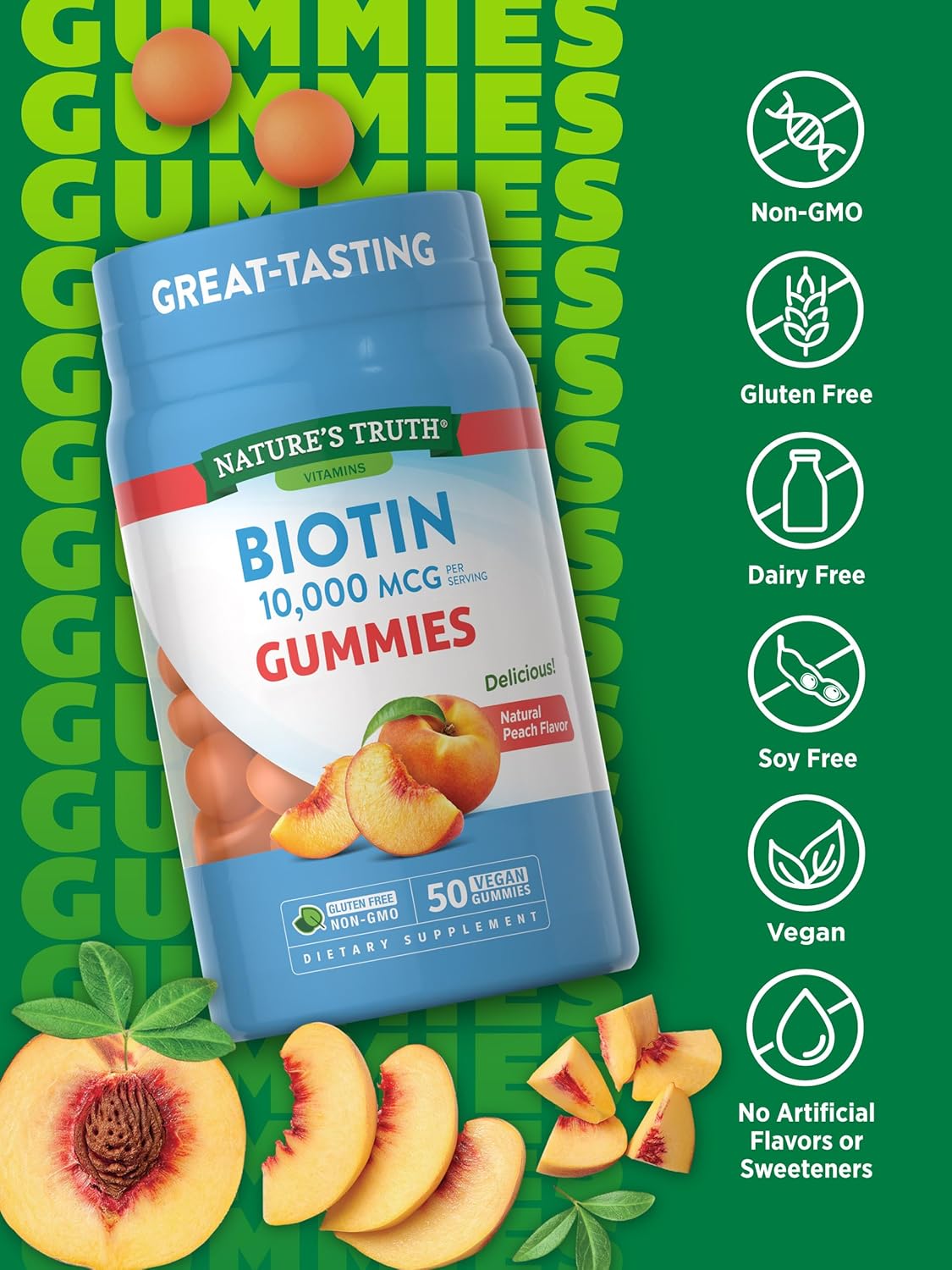 Nature’s Truth Biotin Gummies | 10000mcg | 50 Count | Vegan, Non-GMO & Gluten Free Supplement | Peach Flavor