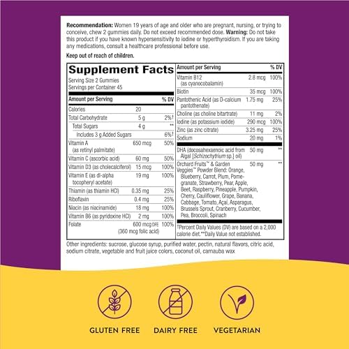 Daily prenatal gummy multivitamin for mom and baby with 100% Daily Value of 8 vitamins and minerals. Made for individuals who are pregnant, nursing, or trying to conceive. With plant-based DHA to support babys healthy eye and brain development.* Gummies are made with pectin, not gelatin, and come in delicious, easy-to-take orange and raspberry lemonade flavored gummies.*This statement has not been evaluated by the Food and Drug Administration. This product is not intended to diagnose, treat, cure, or prevent any disease.