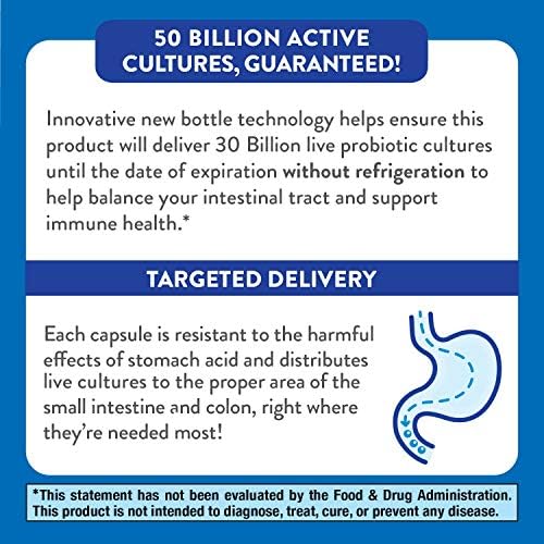 Adults take 1 capsule daily. May be taken at any time, with or without food. Each capsule is resistant to the harmful effects of stomach acid and distributes live cultures to the small intestive and colon. No refrigeration required.