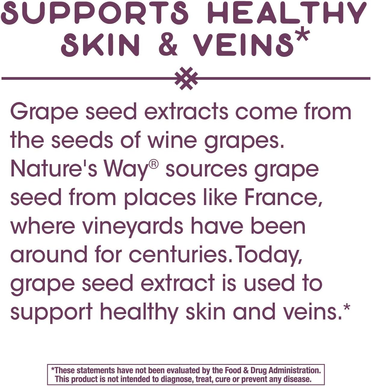 Supports Healthy Skin and Veins*Grape seed extracts come from the seeds of wine grapes. Nature’s Way sources grape seed from places like France, where vineyards have been around for centuries. Today, grape seed extract is used to support healthy skin and veins.**This statement has not been evaluated by the Food and Drug Administration. This product is not intended to diagnose, treat, cure, or prevent any disease.