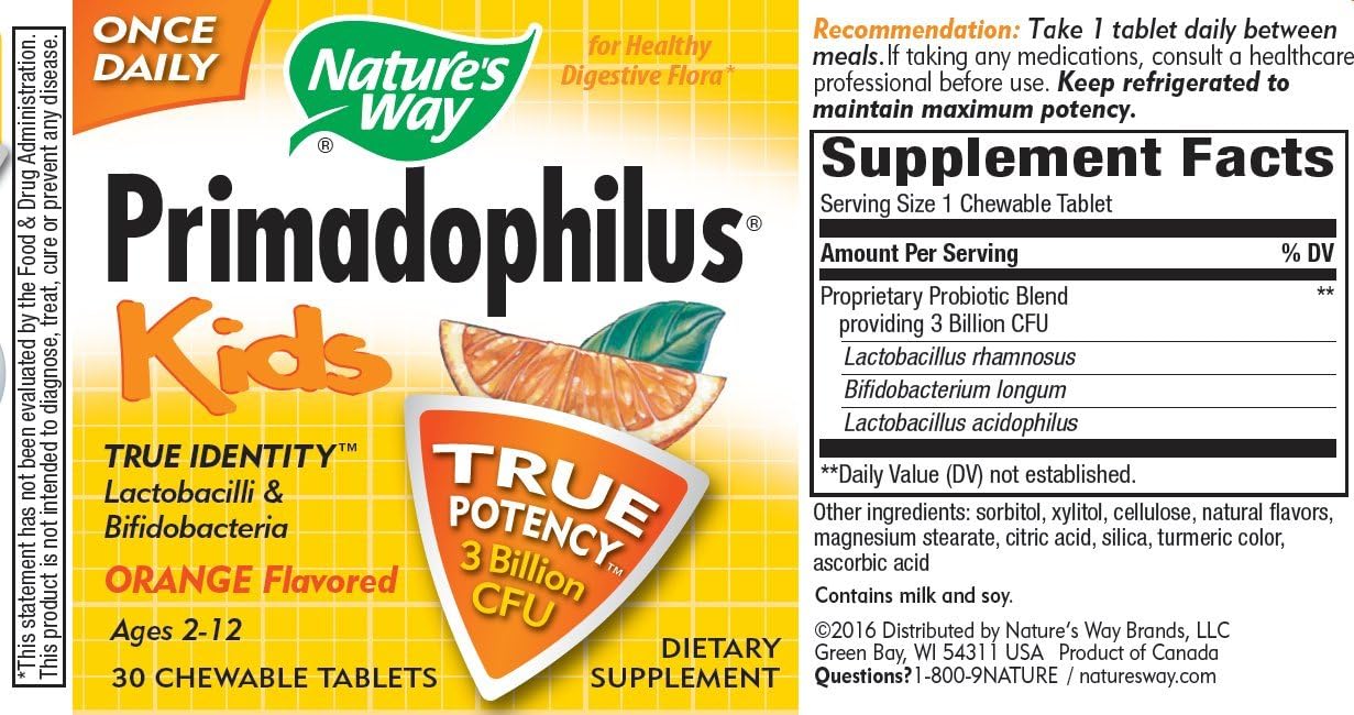 Nature’s Way Primadophilus for Kids, Orange, 30 Count (Pack of 2). 3 billion CFUs. Bifidobacteria and lactobacillus strains including acidophilus. 3 strain formula specifically designed for kids ages 2-12 years. Delicious, natural orange flavor. designed for kids.