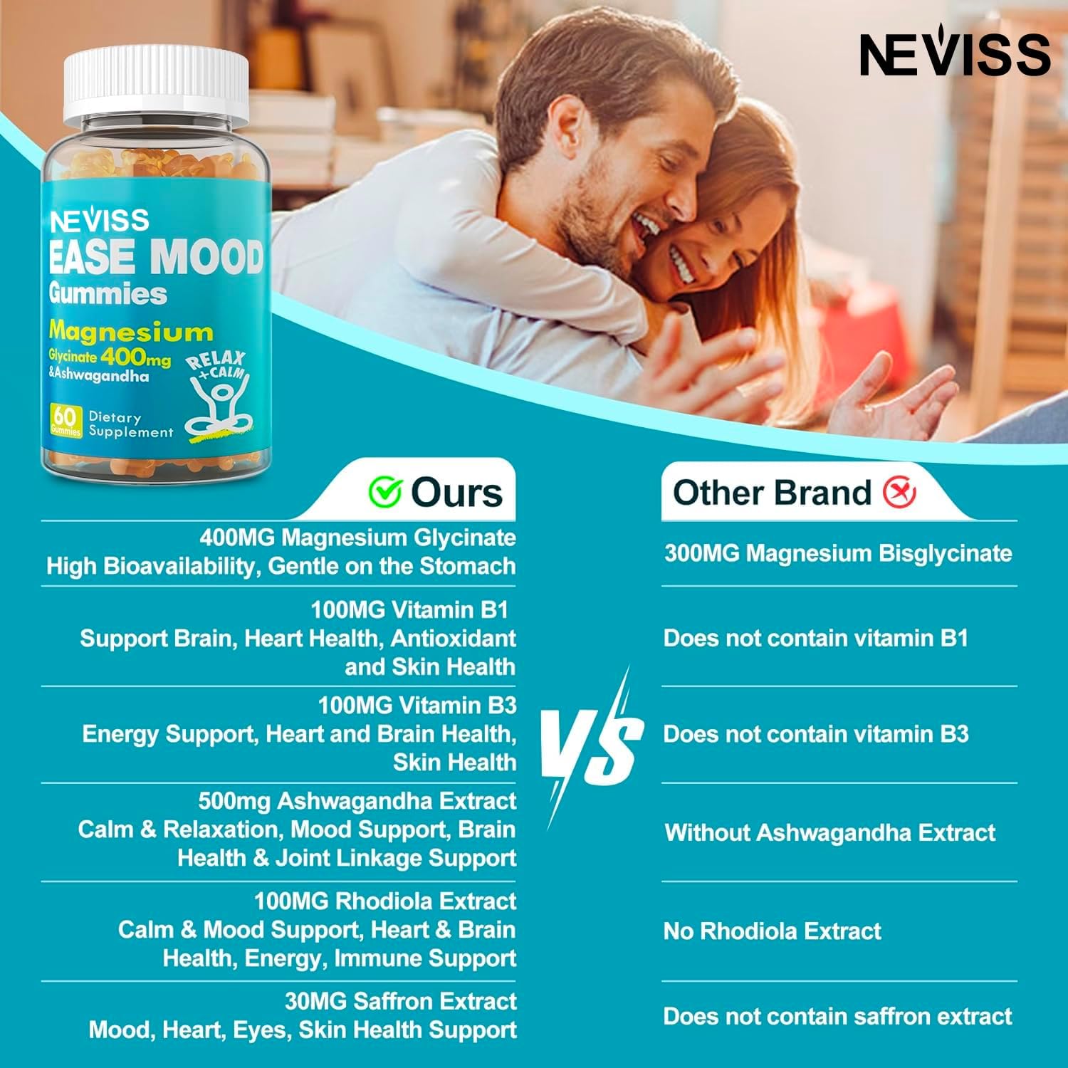 NEVISS Magnesium Glycinate Gummies 400mg, Sugar Free Magnesium Supplement for Adults, with B1, B3, Saffron Ashwagandha & Rhodiola Rosea for Mood & Rest, Calm Magnesium Gummies Chewable, Vegan, 60Ct