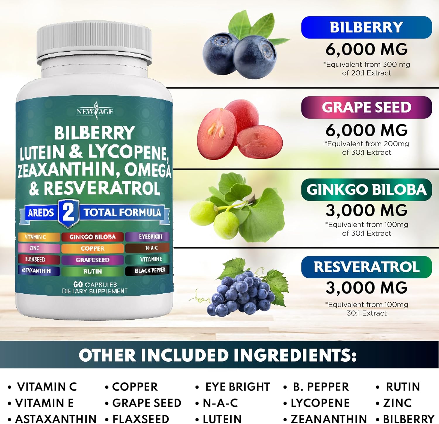 NEW AGE Eye Health Vitamins with Bilberry 6000mg Lutein & Zeaxanthin 40mg Lycopene 40mg Resveratrol 3000mg Grape Seed Extract 6000mg Astaxanthin – Eye Vitamin -120 Count