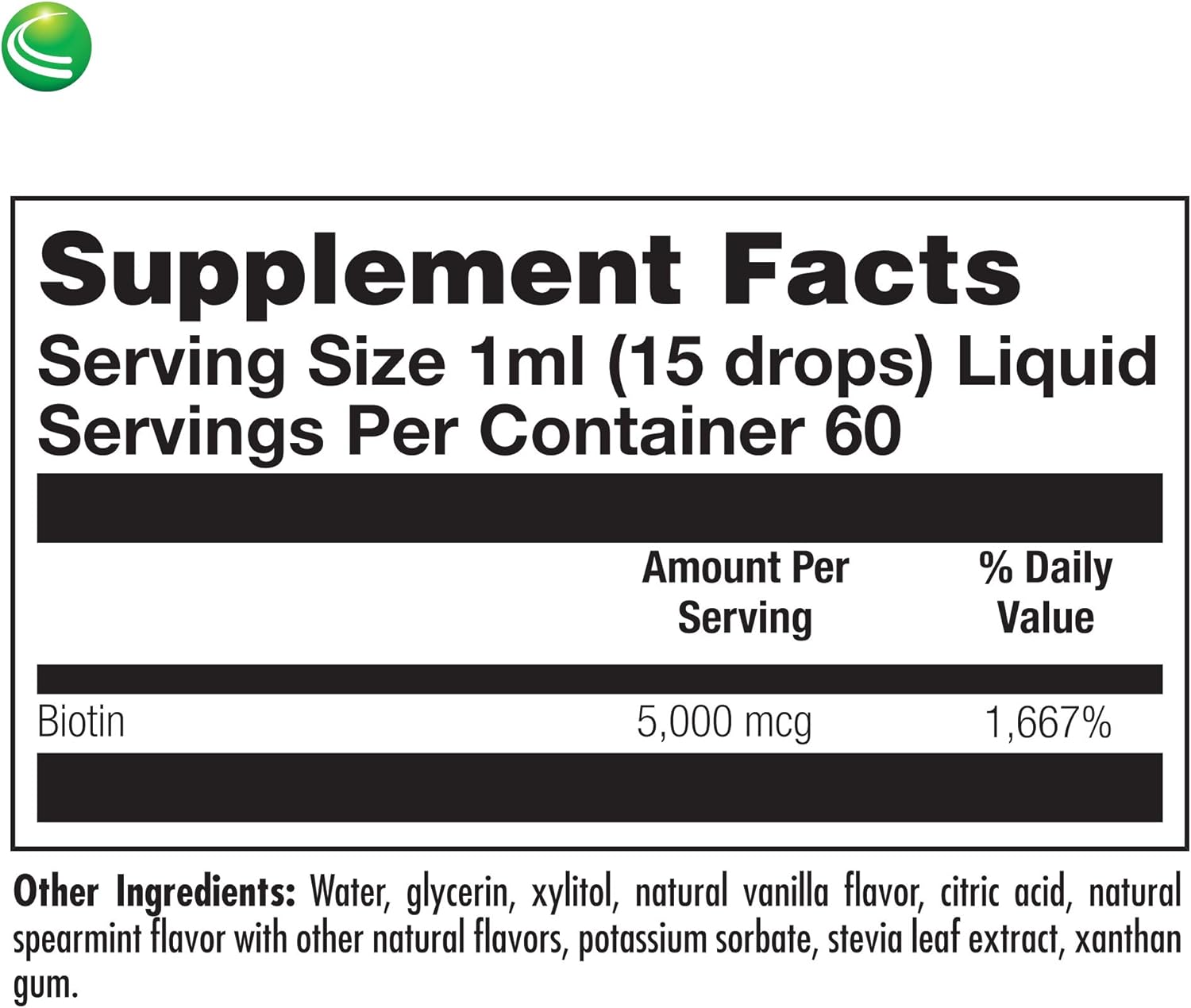 With an easy-to-swallow liquid formula and convenient dropper for precision serving, Biotin 5000 is flavored with vanilla and spearmint natural flavors.