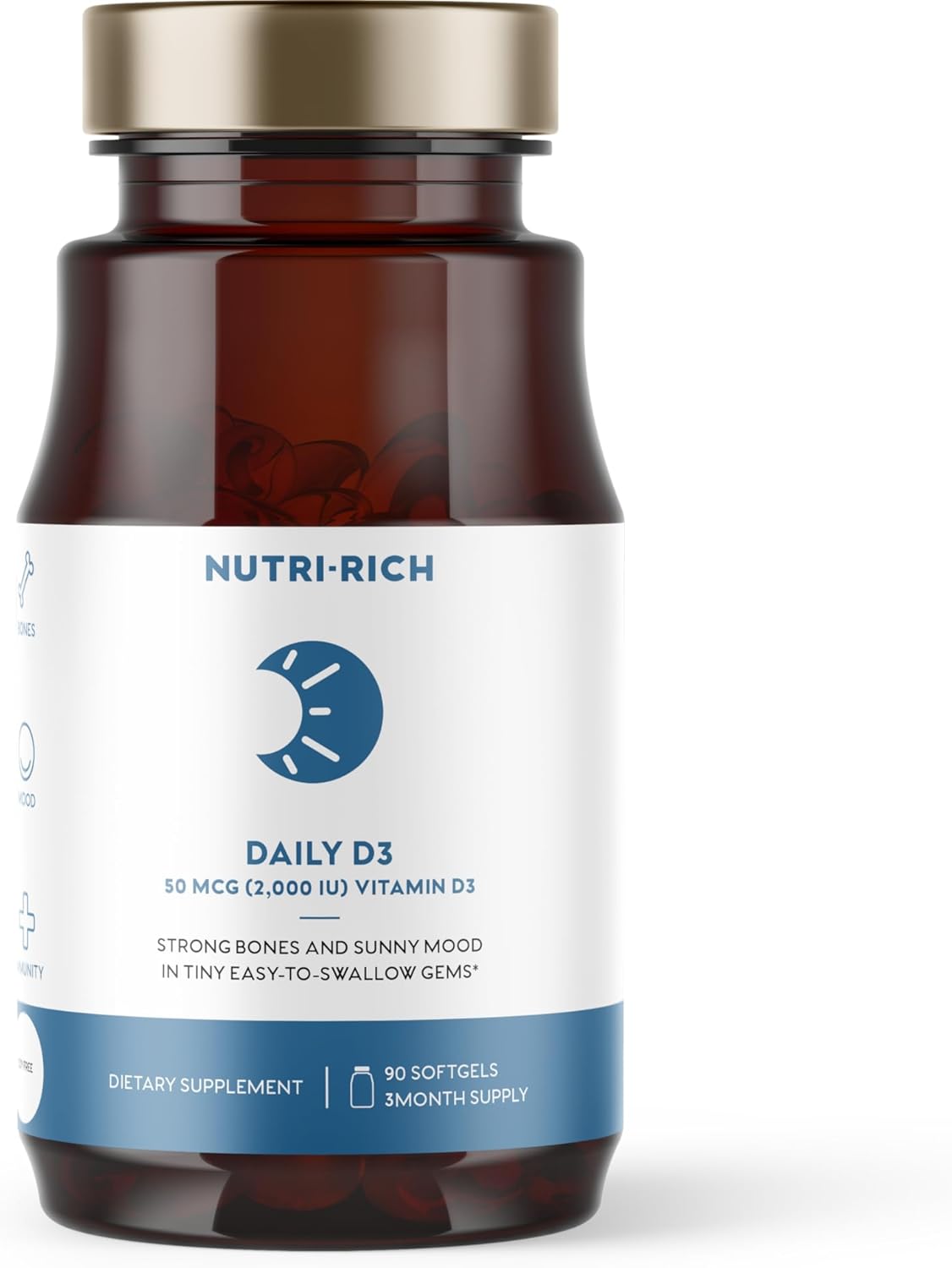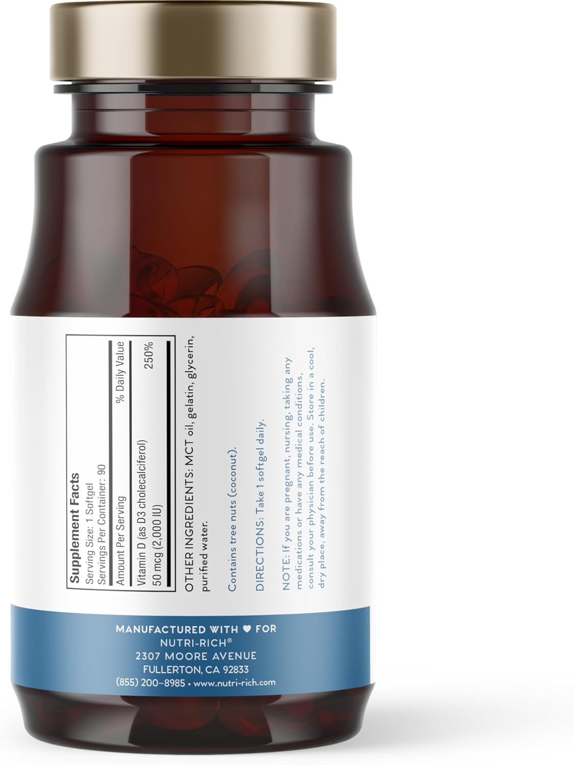 Nutri-Rich Daily Vitamin D3 Cholecalciferol 2,000 IU (50 mcg) for Immune Health Support, Healthy Strong Bones, Muscle Function, Gluten Free, Soy Free (90 Softgels)