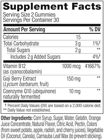 OLLY Extra Strength Daily Energy Gummy, Caffeine Free, 1000mcg Vitamin B12, CoQ10, Goji Berry, Adult Chewable Supplement, Berry Yuzu Flavor – 60 Count
