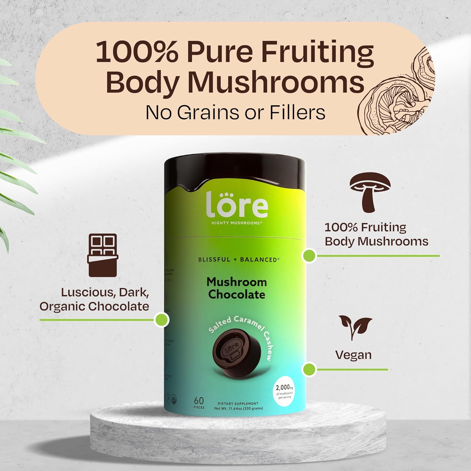 PREMIUM INDULGENCE, UNRIVALED QUALITY: Delight in the sumptuous taste of organic mushroom dark chocolate harmoniously paired with a mouthwatering salted caramel cashew filling. Crafted without any fillers or artificial additives, each bite delivers a pure and delightful experience that tantalizes the taste buds and uplifts the spirit.