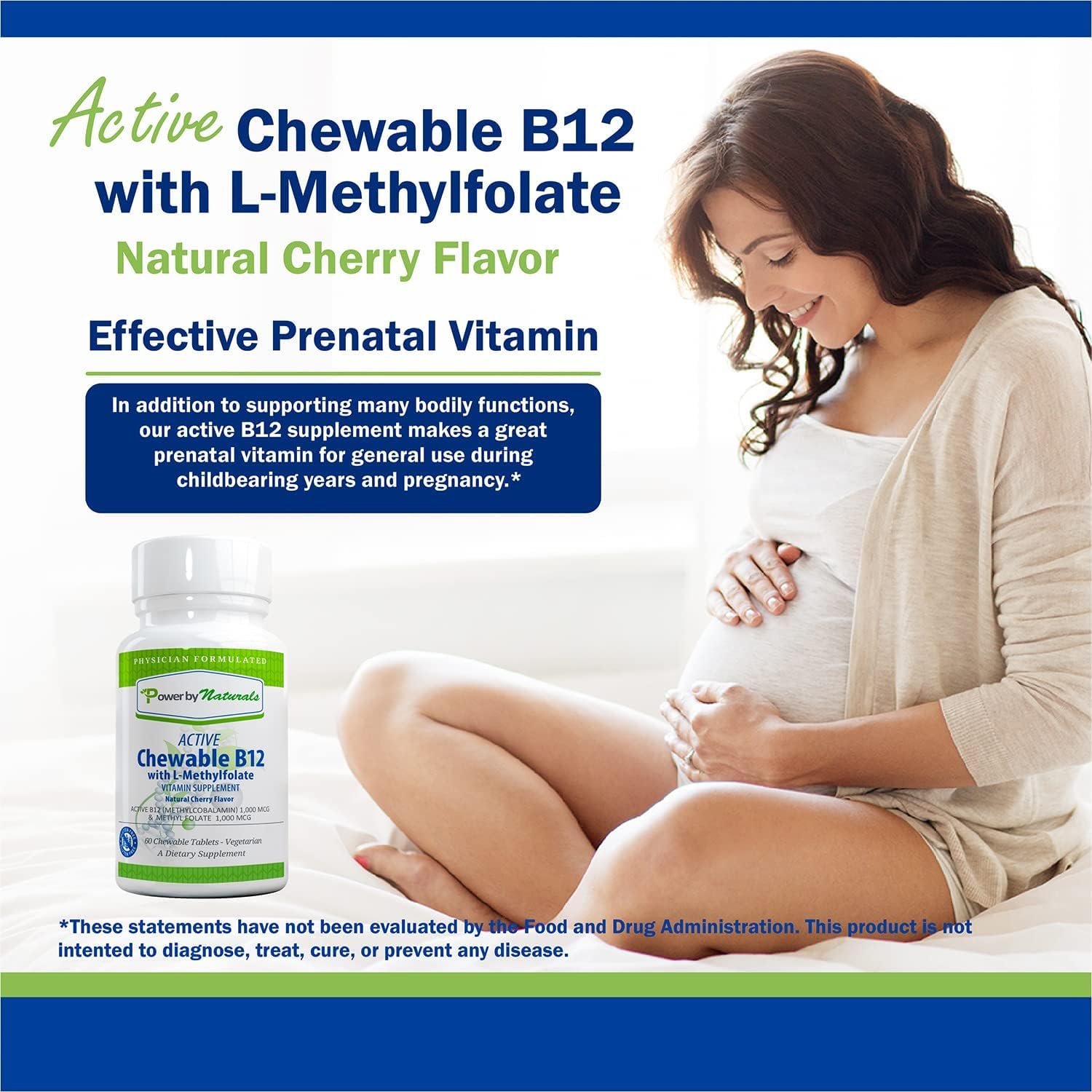 Power By Naturals Active Chewable Methylated B12 with L-Methyl Folate Supplement for Women & Men, Cherry Flavor, 60 Tablets