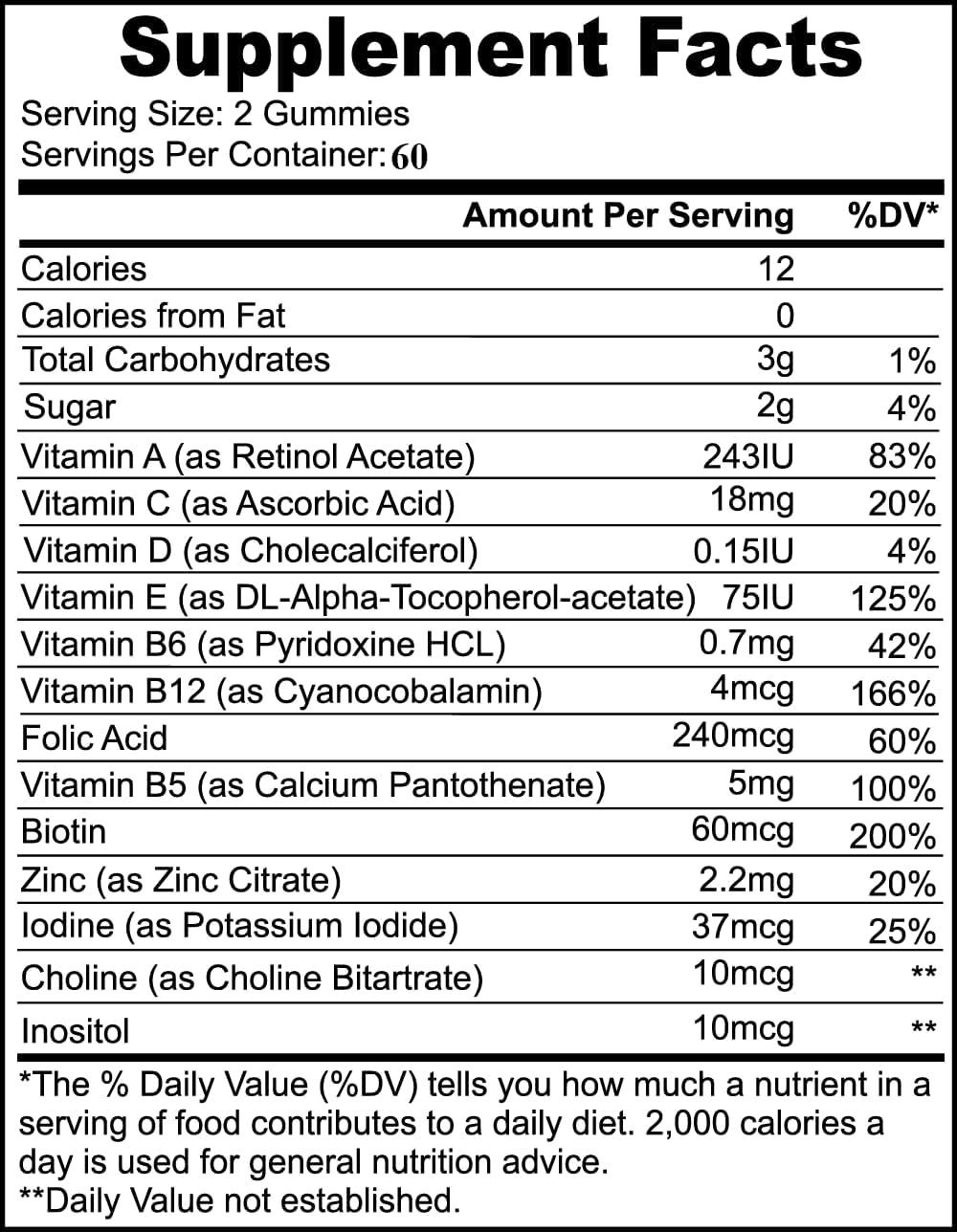 When it comes to Adult multivitamins, we believe in delivering more than just basic nutrients. Our adult gummies are packed with essential vitamins and minerals, including Vitamins A, C, D, E, B6, B12, folic acid, zinc, iodine, choline, and inositol. Plus, they’re made with natural flavors and use pectin instead of gelatin for a vegetarian-friendly option. These delicious gummies make it easy for Adults to get the essential nutrients they need every day, in a tasty and convenient way. Our multivitamins are designed specifically for adults, with a blend of nutrients that support overall health and wellness. The vitamins A, C, and E help to support immune function, while the B vitamins help to convert food into energy. The zinc and iodine help to support healthy thyroid function, and the choline and inositol support cognitive function and brain health.