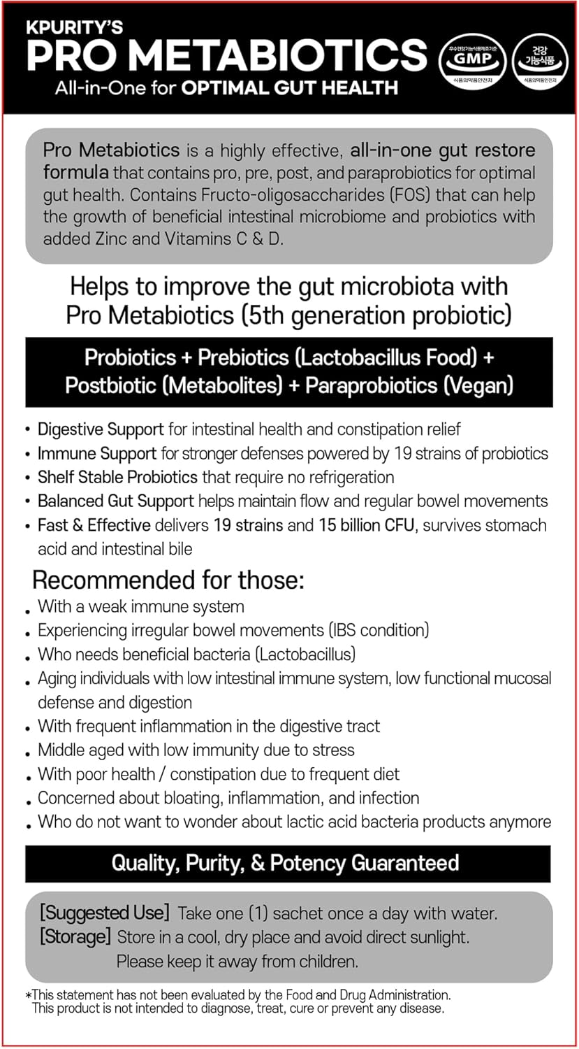 HIGHEST QUALITY – Produced in South Korea, this product is manufactured at a GMP compliant facility with rigorous testing protocols and lab testing of every batch. This comes in powder form and helps to improve the gut microbiota with Pro Metabiotics (5th generation probiotic) containing Probiotics + Prebiotics (Lactobacillus Food) + Postbiotic (Metabolites) + Paraprobiotics (Vegan). Pro Metabiotics is real natural quality and highly effective for your health. Your gut will thank you!