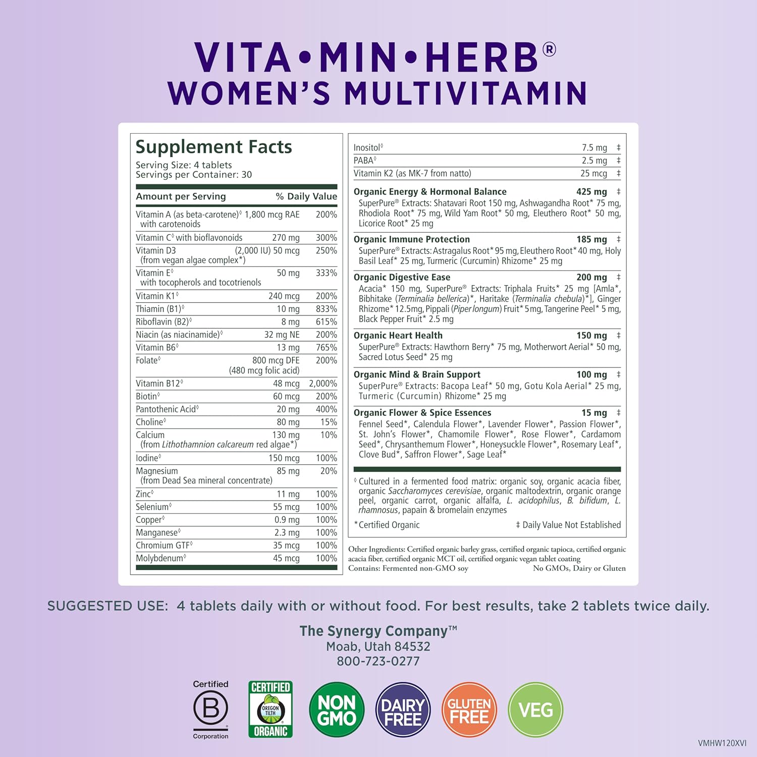 PURE SYNERGY Vita·Min·Herb for Women | Women’s Comprehensive Multivitamin Supplement | Made with Organic Whole Food Non-GMO & Vegan Ingredients | Supports Energy & Immune Health (120 Tablets)