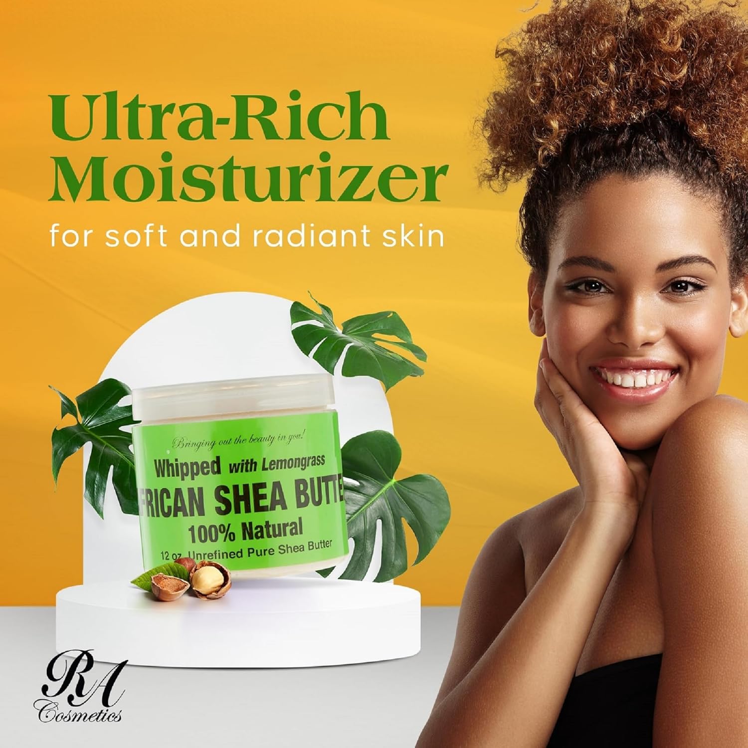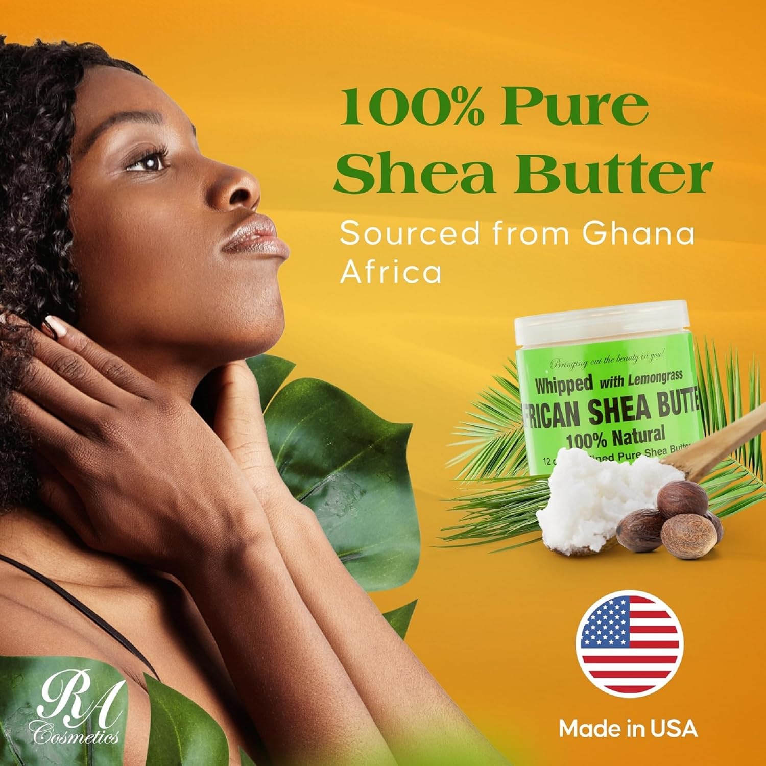 RA COSMETICS Whipped Shea Butter Lemongrass – 100% Pure and Natural African Shea Butter – Handcrafted Moisturizer with Essential Vitamins for Radiant Skin and Luscious Hair – 12oz Jar