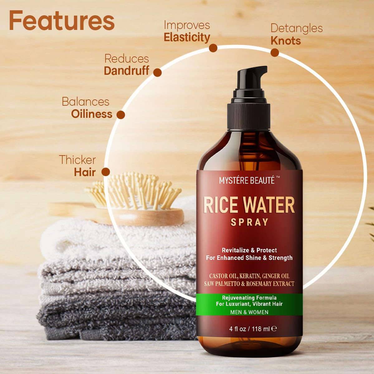 Unlock Hair Growth Potential: Discover the enriching benefits of rice water for hair growth. Our MYSTÉRE BEAUTÉ Rice Water Spray stimulates and nourishes hair follicles, becoming an essential part of your hair growth regime.