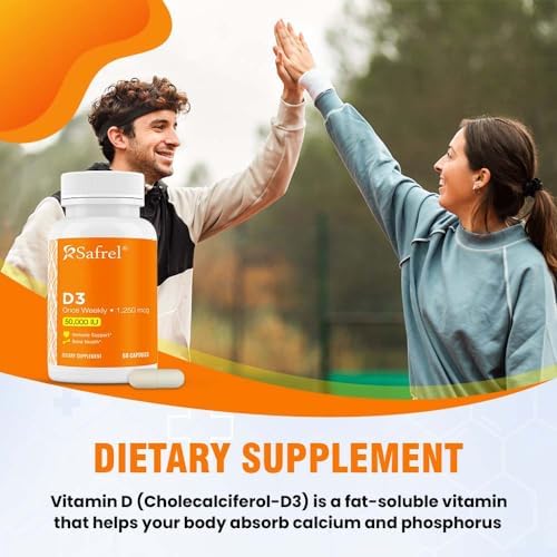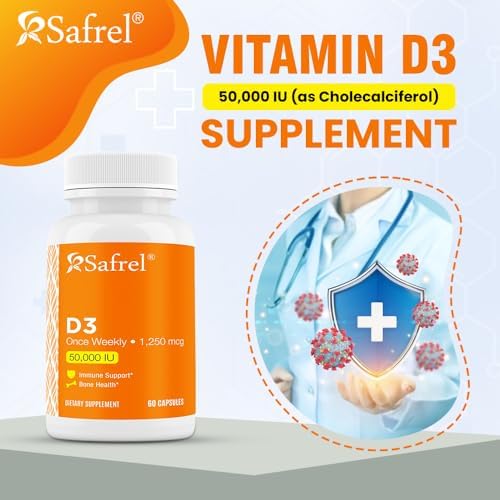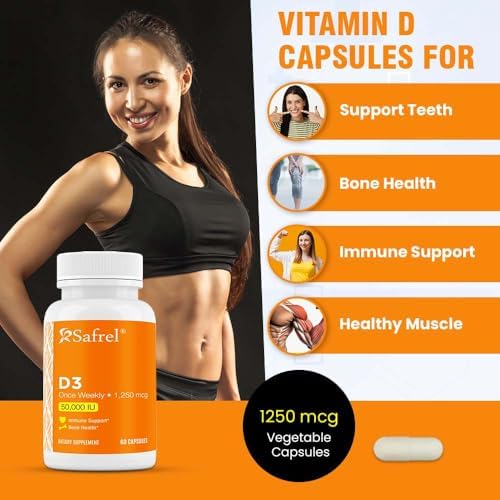 Safrel Vitamin D3 50,000 IU Supplement – Once Weekly Dose – 1250 mcg Veg Caps – Bone, Teeth, & Immune Support – 1 Year Supply – 60 Capsules – Adults & Seniors