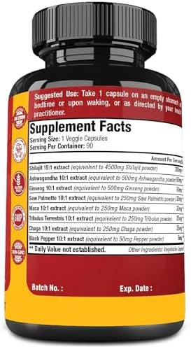 Special Formula of 8 herbal ingredients: Shilajit powder (from 15:1 pure concentrated form of Shilajit extract) & Ashwagandha, Ginseng, Saw Palmetto, Maca, Tribulus, Chaga, Black Pepper (all from 10:1 extract).