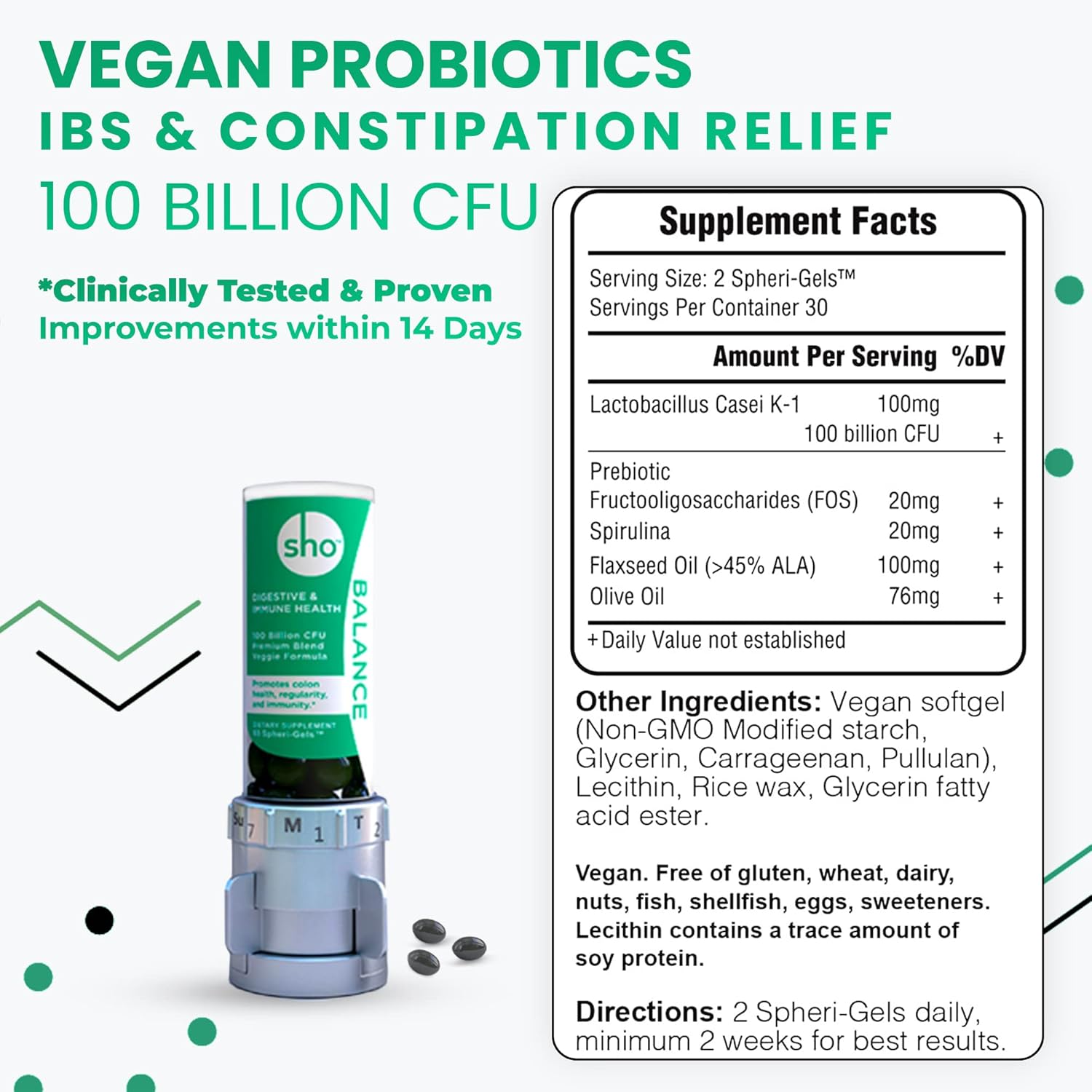 SHO Balance 100 Billion CFU Prebiotics & Probiotics for Digestive Health, Gut Health Vegan Supplement for Women & Men, Lactobacillus Casei, Shelf Stable 60 Softgels with Dispenser